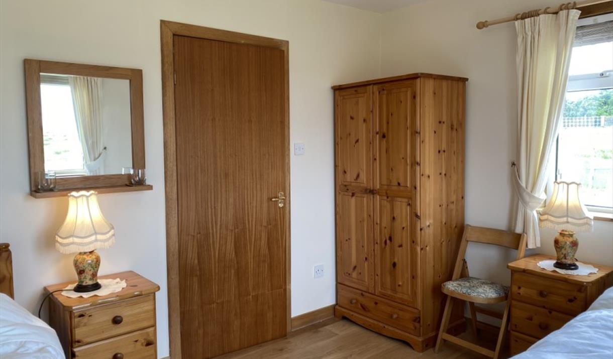 On the ground floor the large lounge faces west providing panoramic views of the landscape. The kitchen/dinette is fitted with electric cooker, microwave oven, dishwasher, washing machine, fridge, toaster, etc. There are two bedrooms on the ground floor, one double and another with twin beds. Each room has its own wash basin. The bathroom has a bath and a walk in shower.