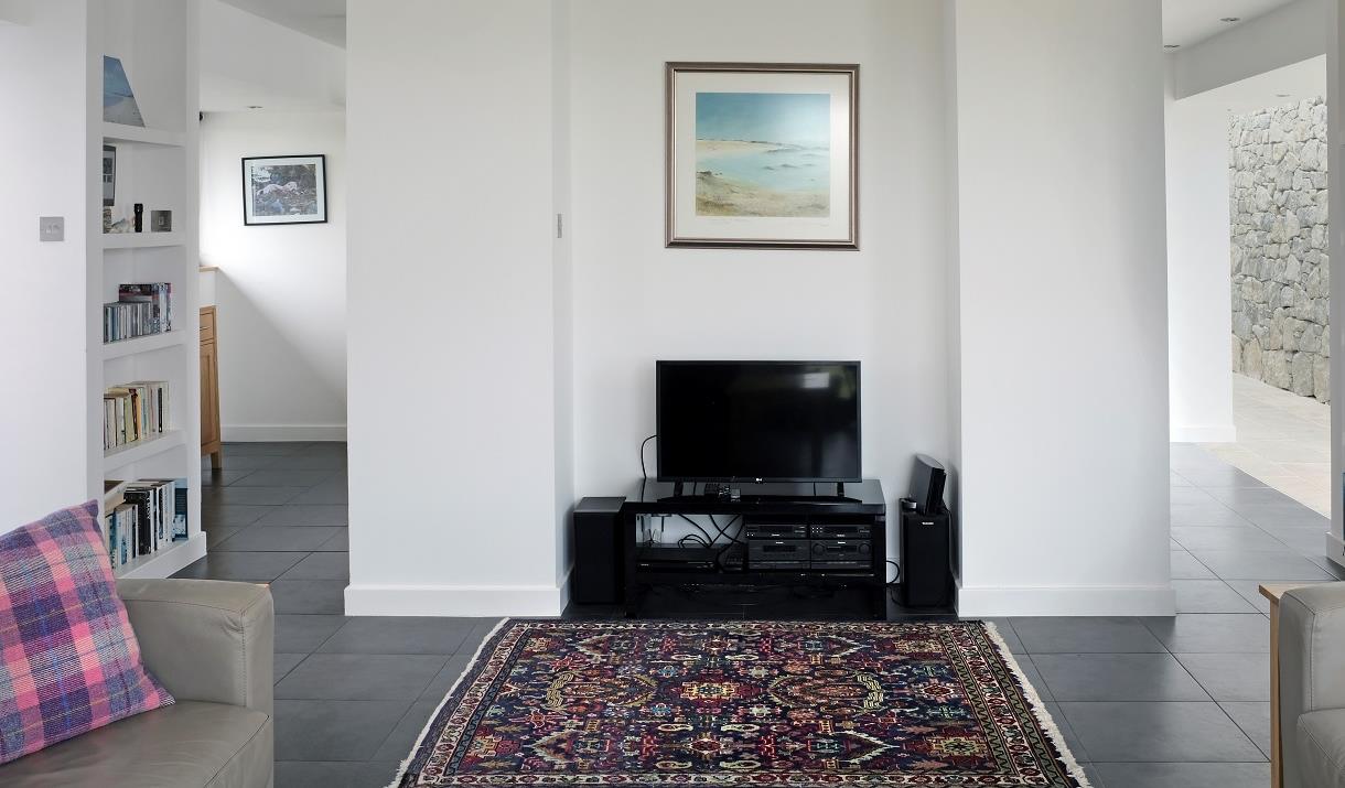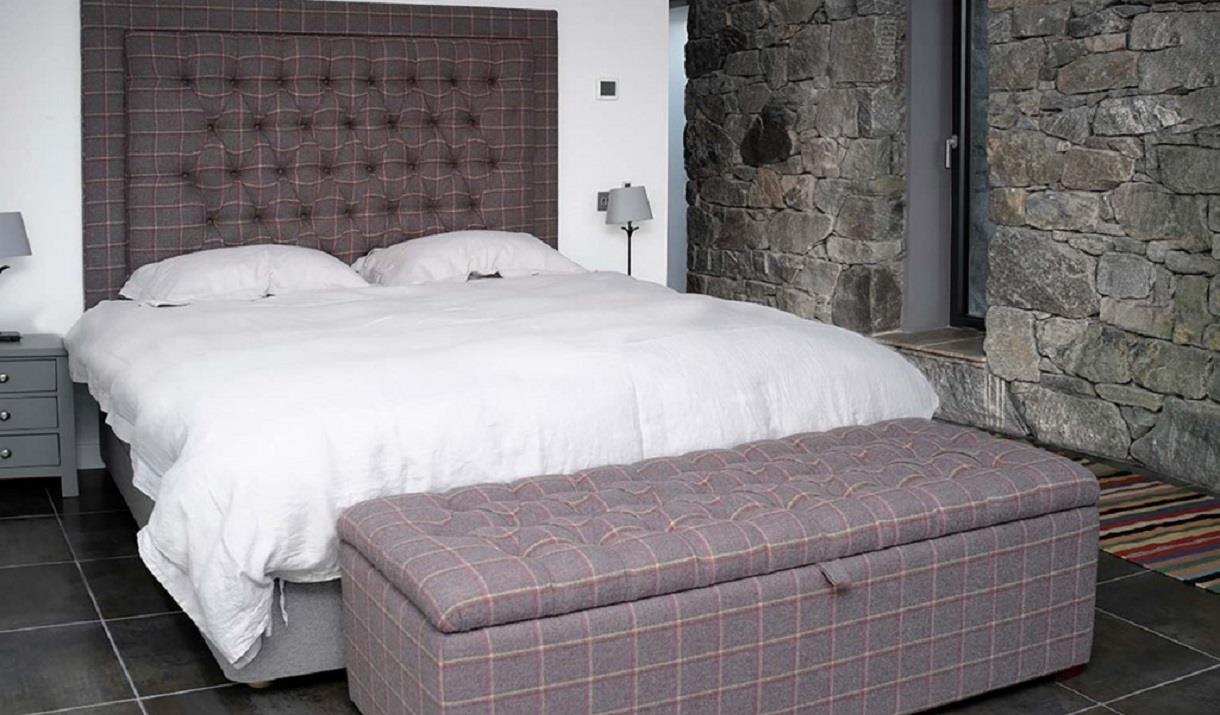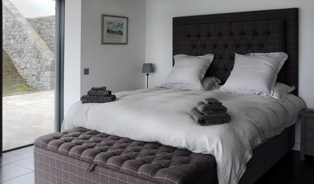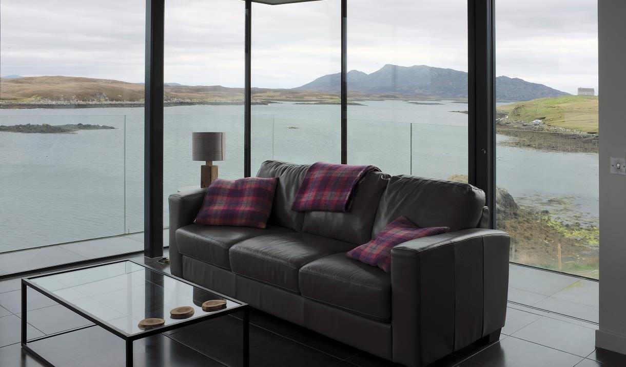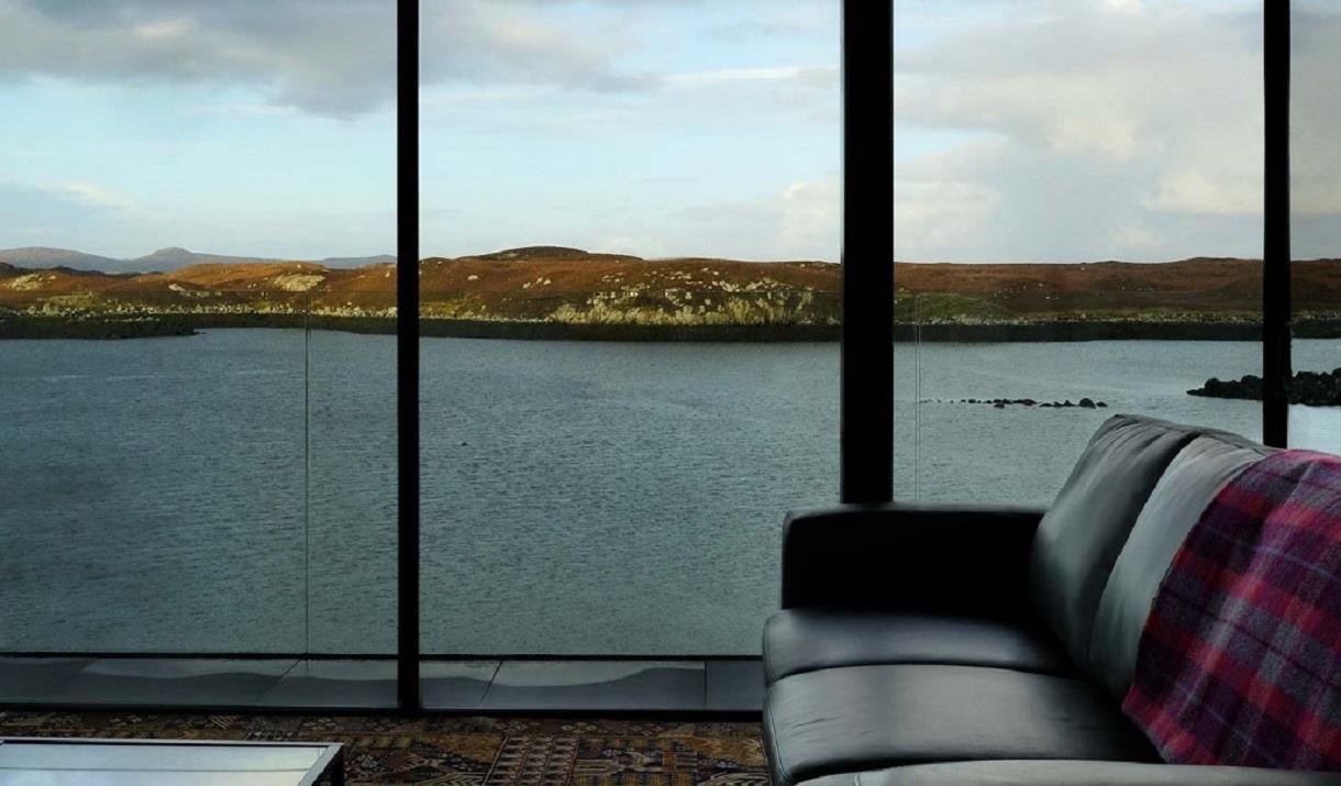 Built to a very high specification over a sea loch in North Uist the house has 4 bedrooms 3 Bathrooms with two large lounges which includes a TV and Hwam wood/peat burning stove in each. The housen has underfloor heating and electric blinds in the large granite and glass extension. There is a large bathroom with an Ashton and Bentley bath overlooking the loch. In the master bedroom there is a Harrison and Spinks Super King Bed