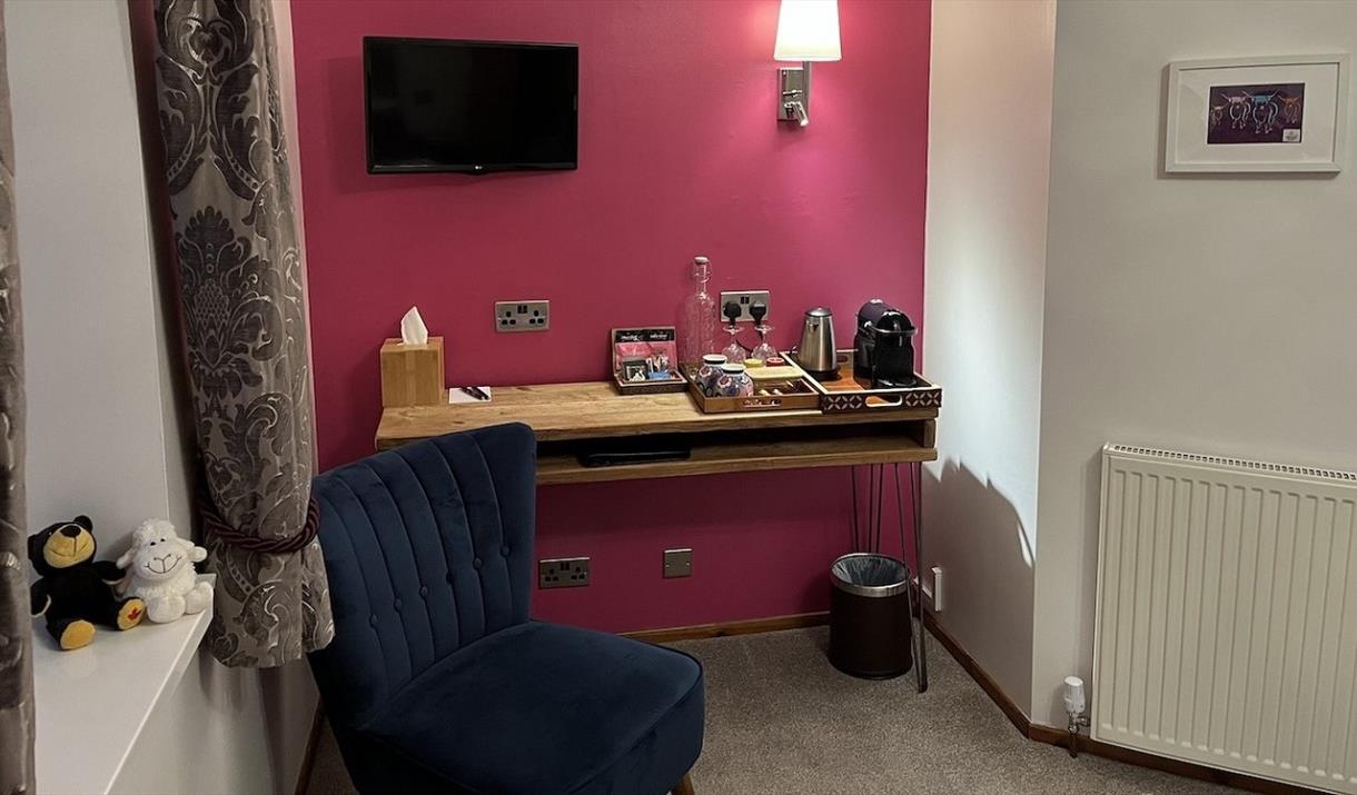 We have four rooms comprising two Super-King Rooms (En-Suite), a Twin Room (En-Suite), and a Double Room (with Private Bathroom), with guests having access to two lounges. Each room has a comprehensive welcome tray, including Nespresso machine and a small mini fridge with fresh milk. Our very comfortable beds have Egyptian cotton bed-linen and goose-down duvets.