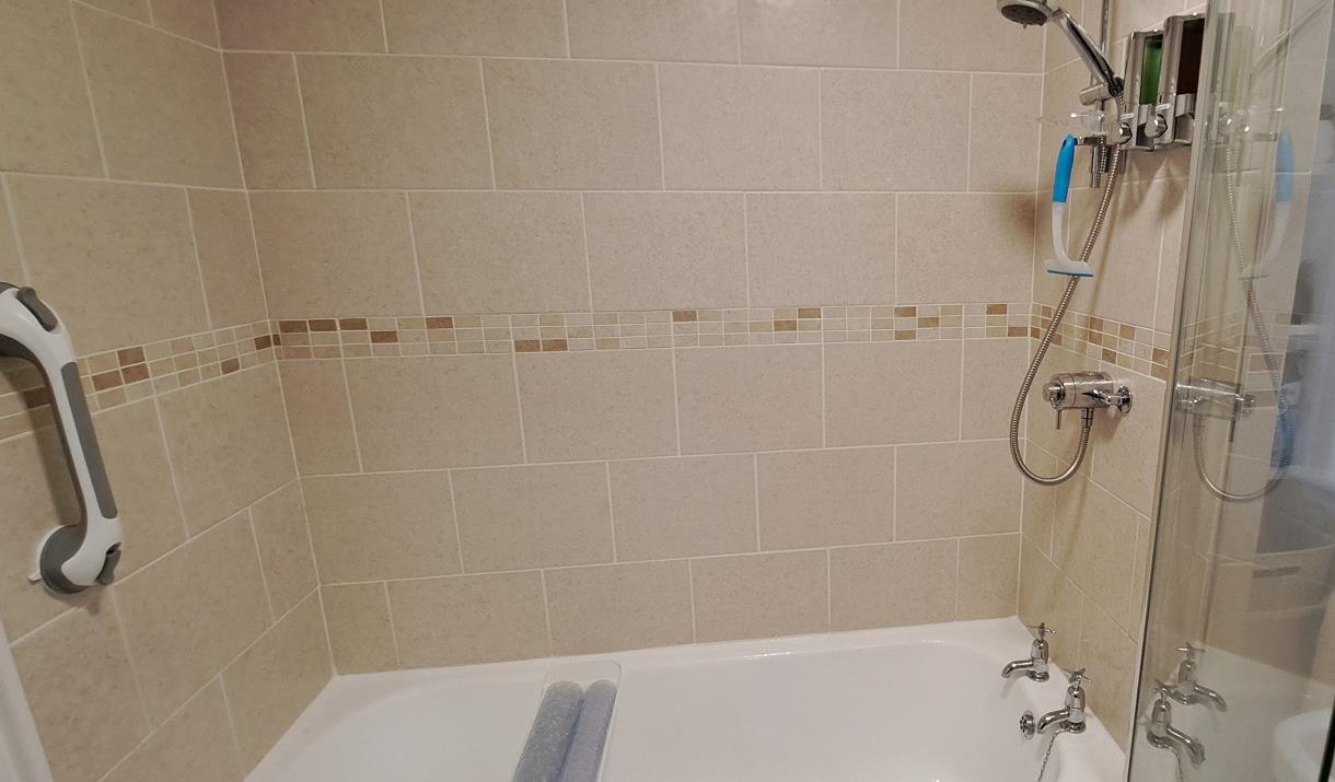 Bathroom (downstairs) - shower over original enamel bath, toilet and sink