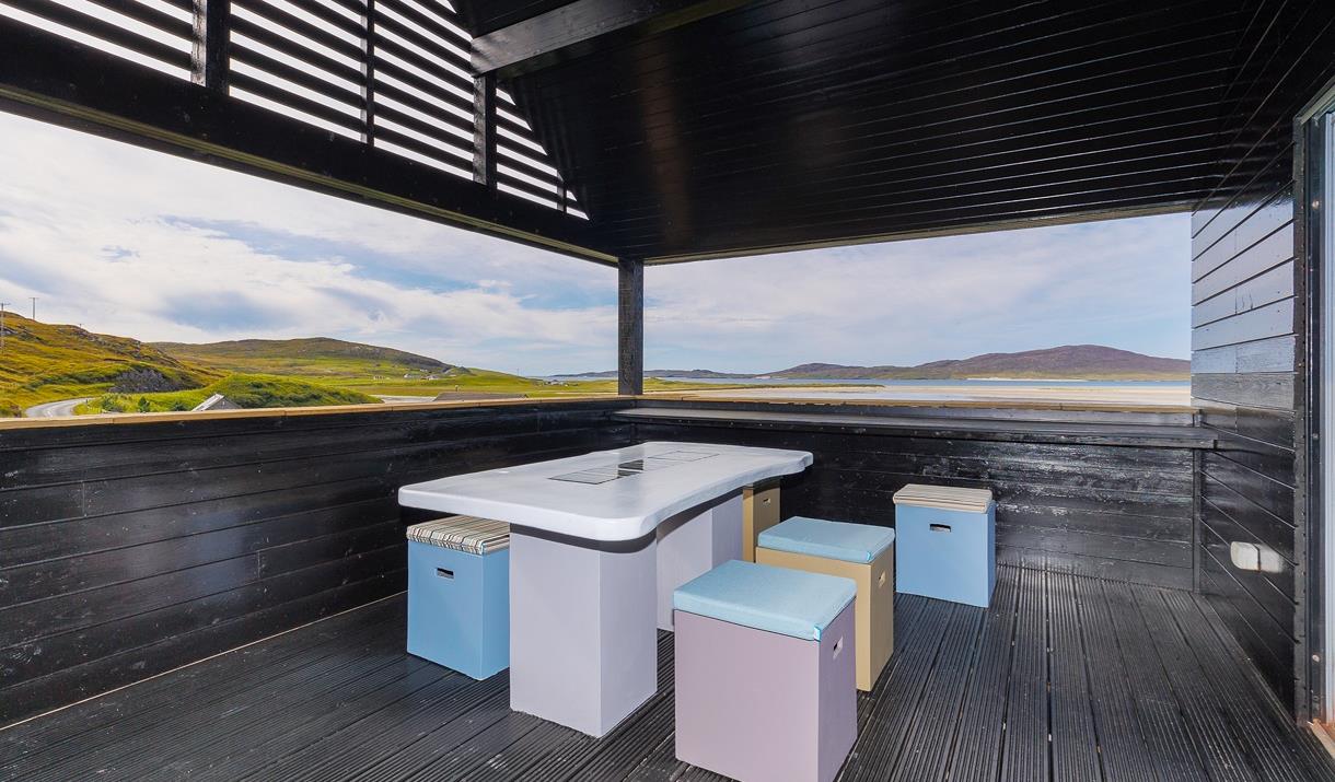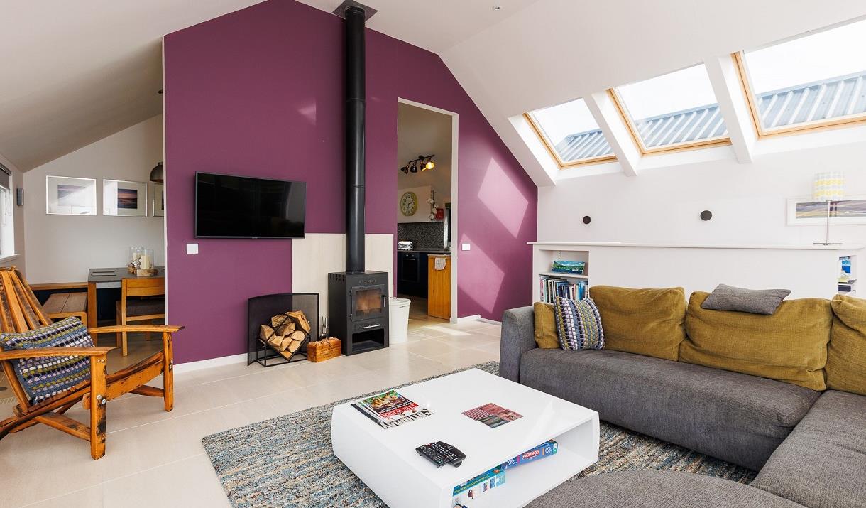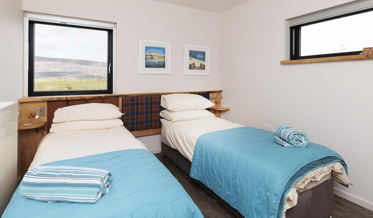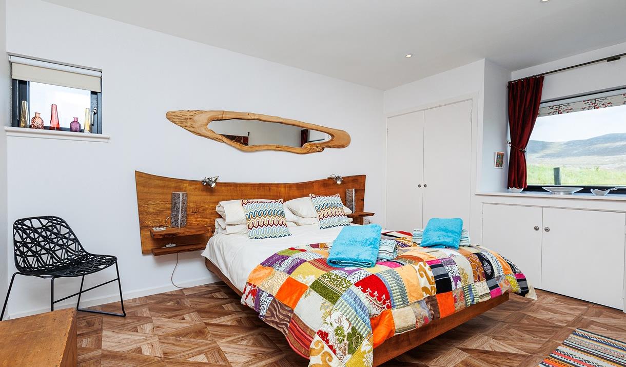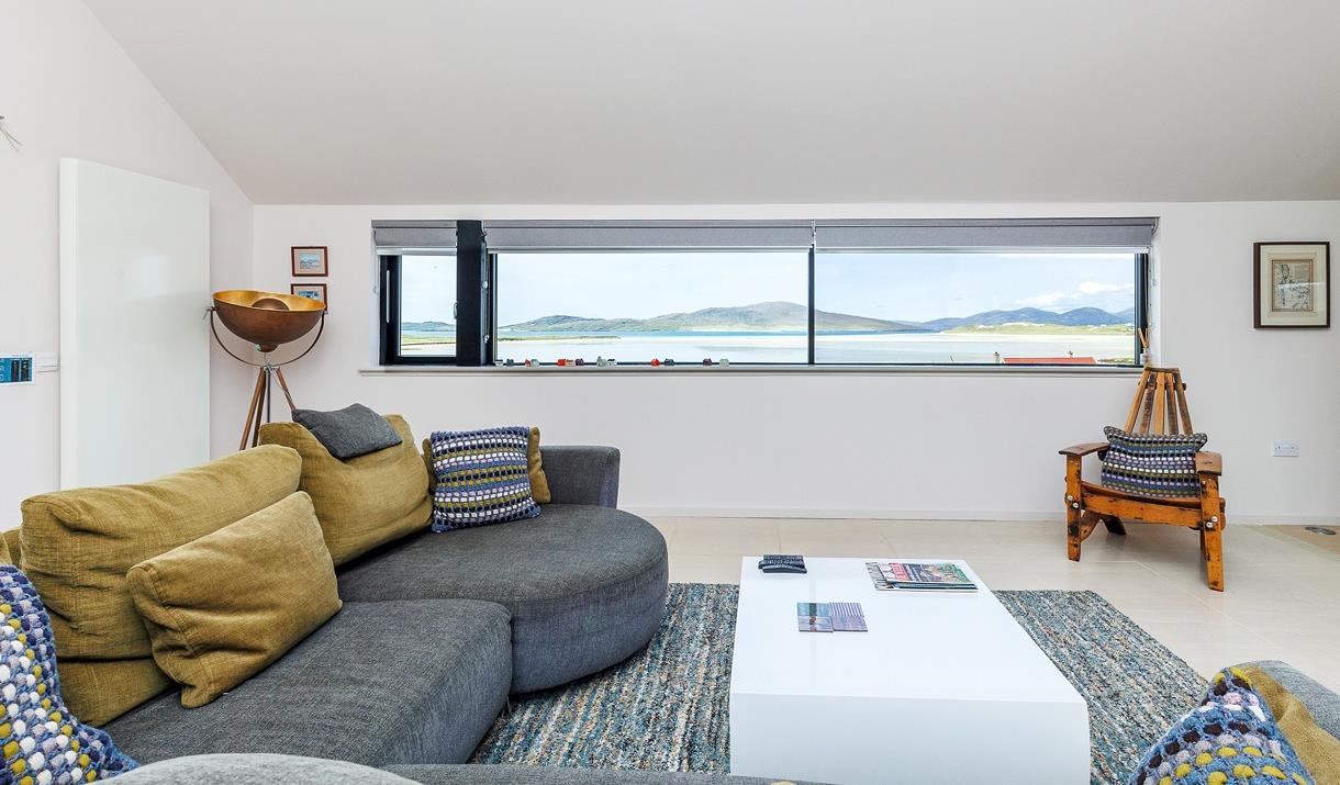 Park the car at the end of the crocosmia-lined driveway, drop your bags, grab an Isle of Harris gin or a treat from the welcome goodie-bag and get yourself onto Harris-time relaxing on the balcony watching a classic Hebridean sunset over Taransay or stretching out on the sofa while delving into a book about the islands’ history.