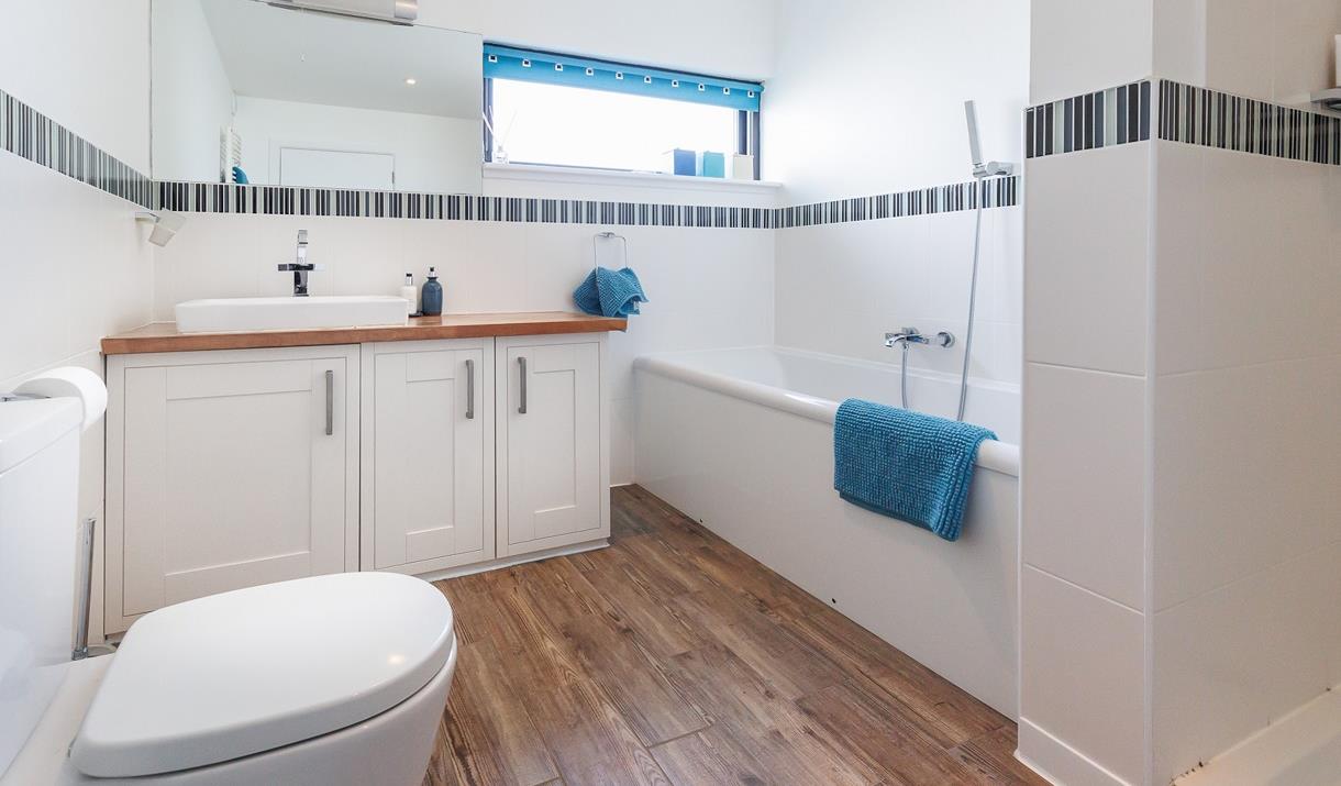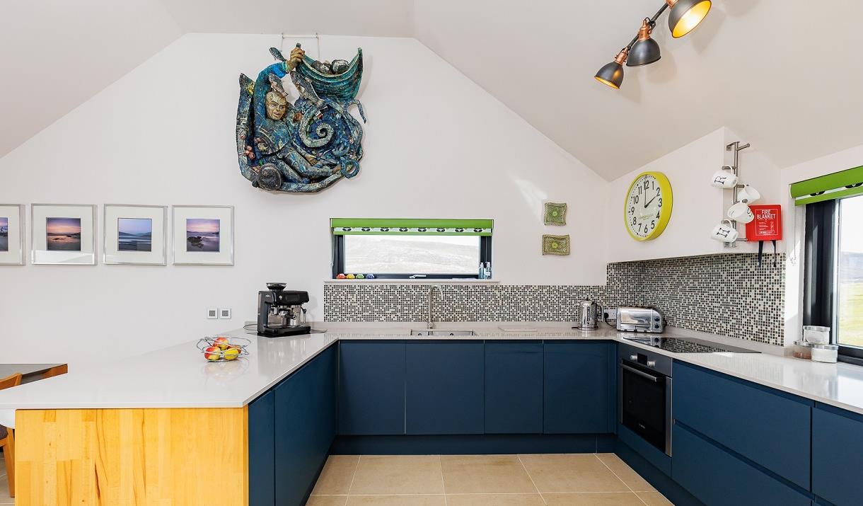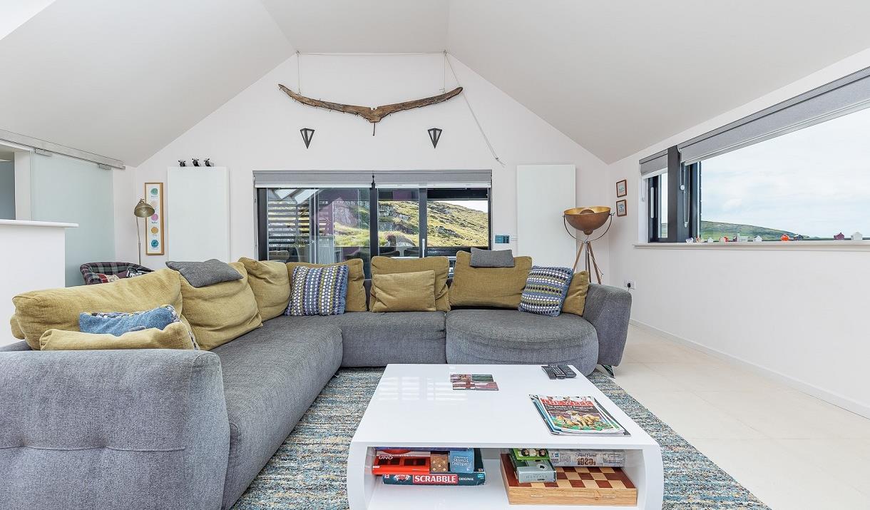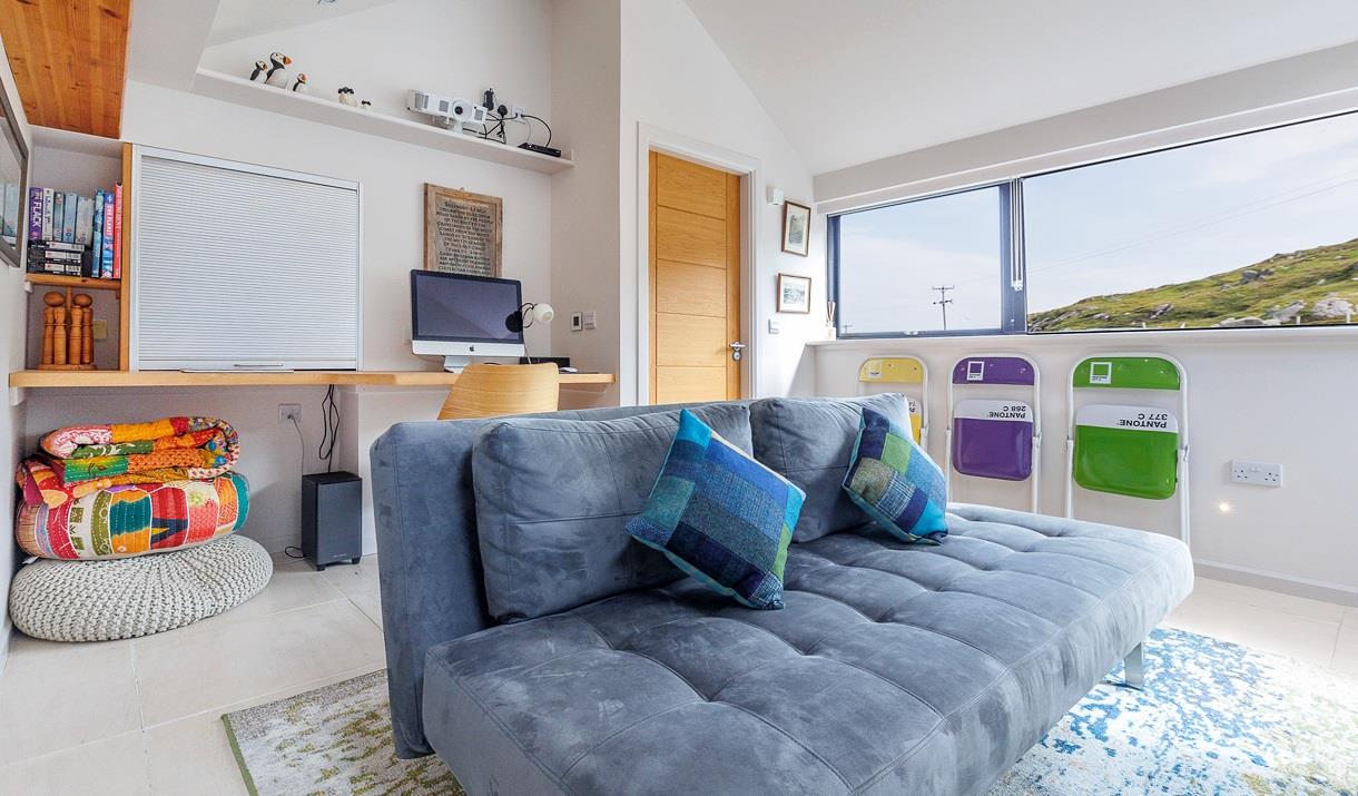 The open-plan living-area, which is designed to bring the outdoors indoors, takes up the first floor with a comfortable lounge, dining-area and fully-equipped kitchen, with dishwasher and oven/hob. There is a separate snug that can be converted into sleeping accommodation, with its adjacent cloakroom becoming an en-suite with its own shower. The first floor is completed by a large balcony for relaxing and enjoying the spectacular sunsets. The house is furnished with a range of art and crafts from the Hebrides as well as further afield as well as an extensive library of local books.