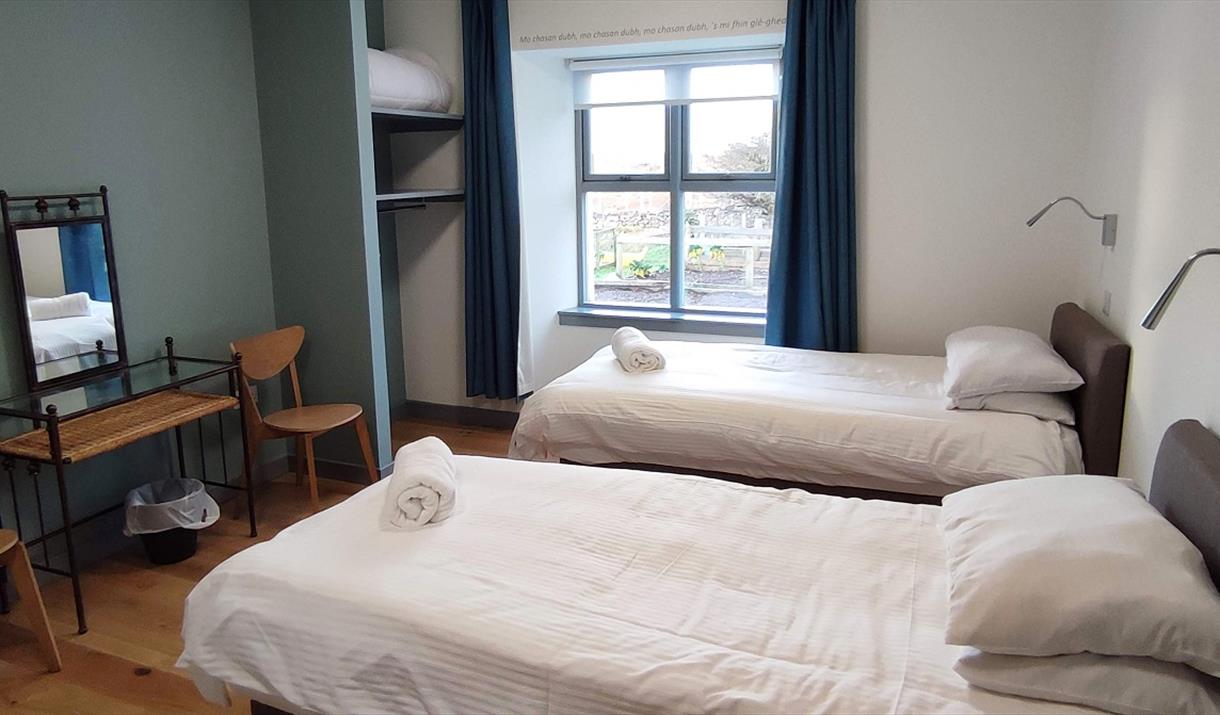 The Grinneabhat building is a former school, built in the 1870s. The accommodation is in the schoolhouse, while the former classrooms house a café, gallery space showing contemporary art and cultural exhibitions, and a community room hosting events, workshops and classes which guests are welcome to attend. There is also a launderette, a drying room and a garden with community growing plots and polycrub (a type of storm-proof greenhouse).