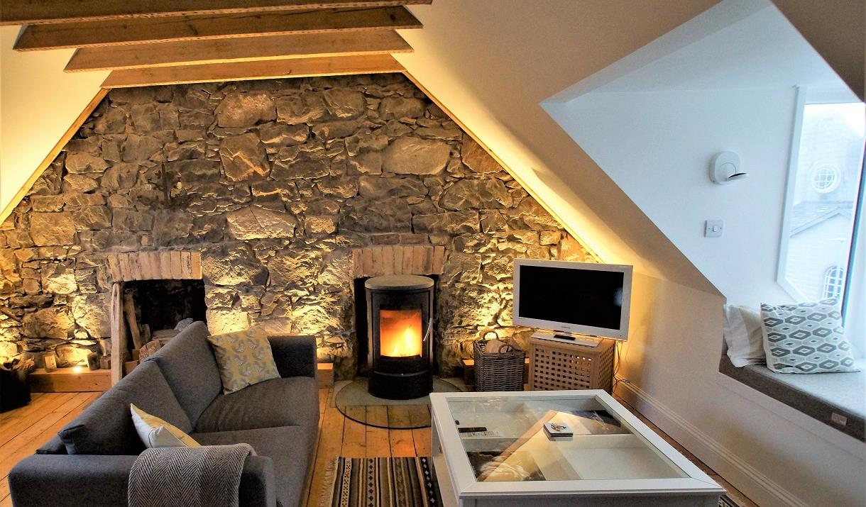 This beautifully restored traditional Victorian stone house combines the charm of the old, showcasing exposed walls and beams, original flooring and opened fireplaces, with modern, high-quality equipment and interiors, Jacuzzi bath, Hebridean art and beautiful Harris Tweed upholstery.