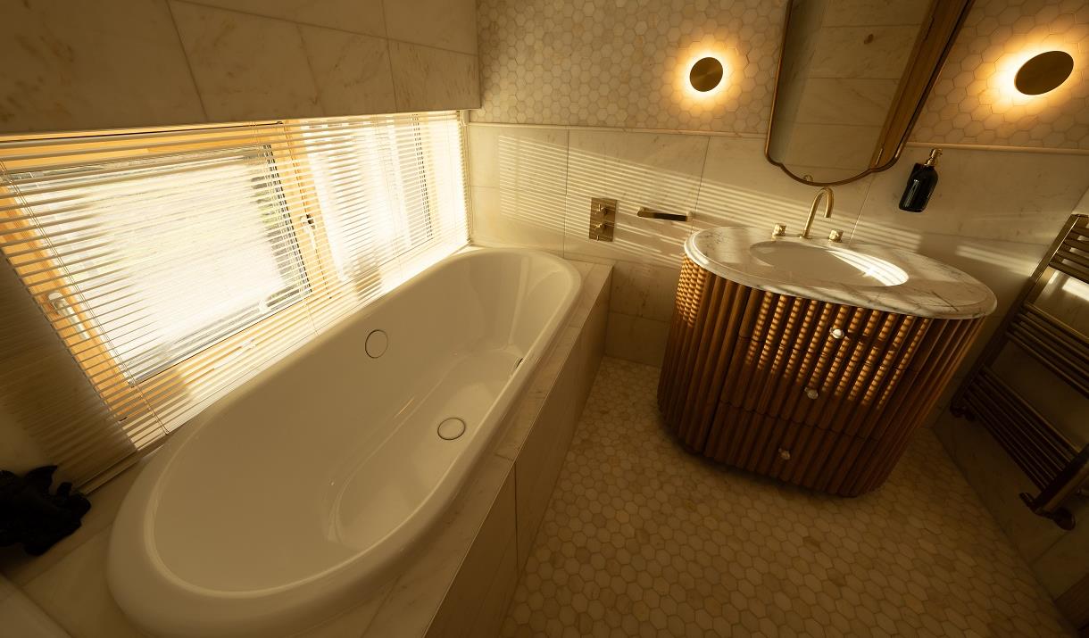 In the annexe, as well as the living space and kitchen, there is a marble-tiled bathroom with a bathtub perfectly placed to look over the beach. Upstairs, there is the sleeping space, which includes a king-sized built-in cabin bed (accessible only from one side). At the end of the bed, there are doors which conceal a smart TV with subscription services like Netflix, Disney+ and Apple TV+.
