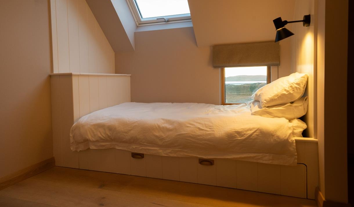 In the main house, there are two upstairs king-sized bedrooms, a cosy single cabin bed with a trundle underneath designed specifically for kids, plus two marble-tiled bathrooms both with bathtubs overlooking the beach and hills. The master bedroom has a bespoke glass window that runs down the wall and into the ceiling so you can watch the sky and scenery from the Soho Home bed. And when it’s time to sleep, there is a motorised curtain controlled from a button next to the bed. Downstairs in the main house is an accessible king-sized bedroom with views across Uig Sands and the hills, plus an accessible shower room finished in Bert & May tiles.