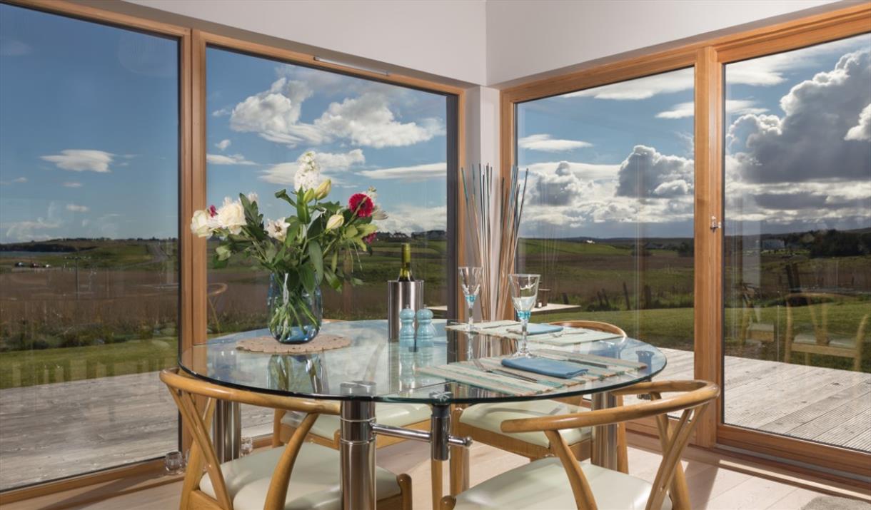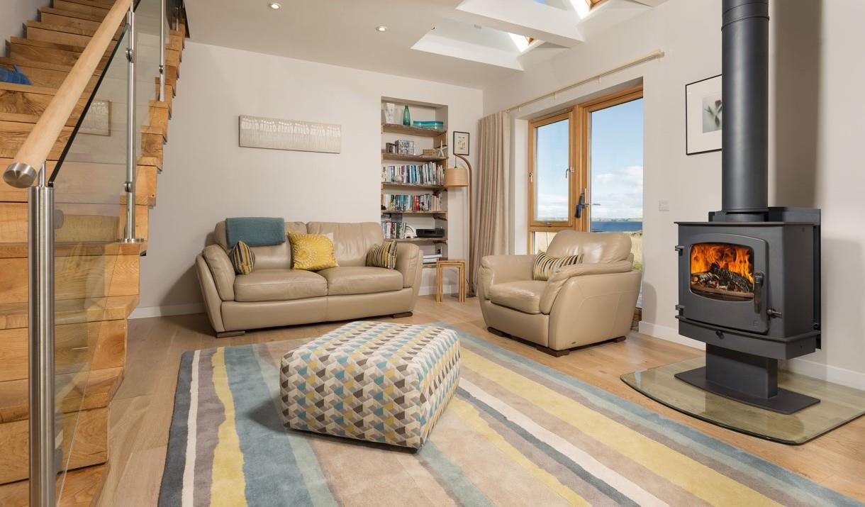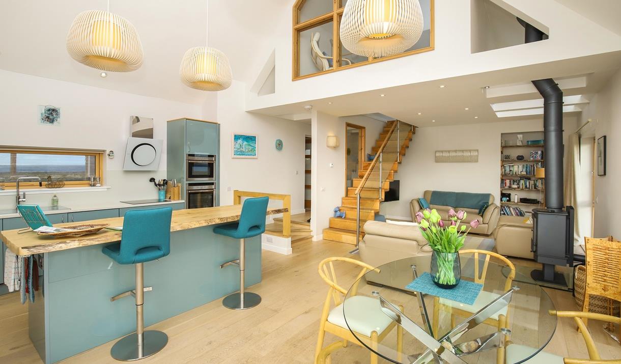 The kitchen is well stocked for foodies, with induction hob, ovens, wine chillers and fridge, cookery books to inspire, oh and a dishwasher to make tidying up a little easier. Underfloor heating keeps oak floors warm underfoot and a multi-fuel stove keeps you cosy even in the wildest weather. South and west-facing floor-to-ceiling windows bringing the outside in and sliding doors open onto a wraparound deck with views of the moor and sea.