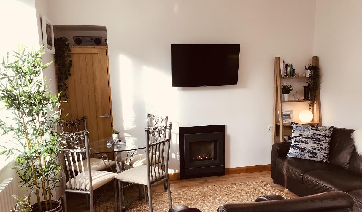 The stylish open plan living room and kitchen offers comfortable seating, flatscreen 4K HDR LED smart tv , cozy gas fire, and dining area. Our fully fitted and well-stocked kitchen comprises washer/dryer, wall mounted double oven, hob, dishwasher, and frost-free fridge freezer.