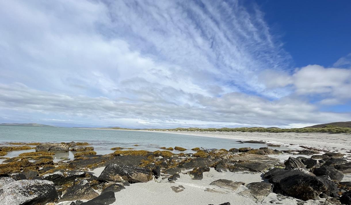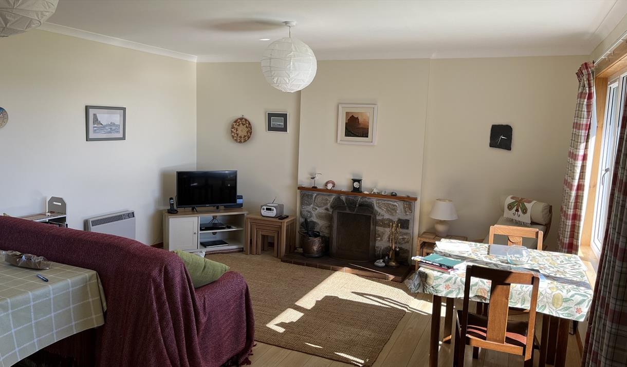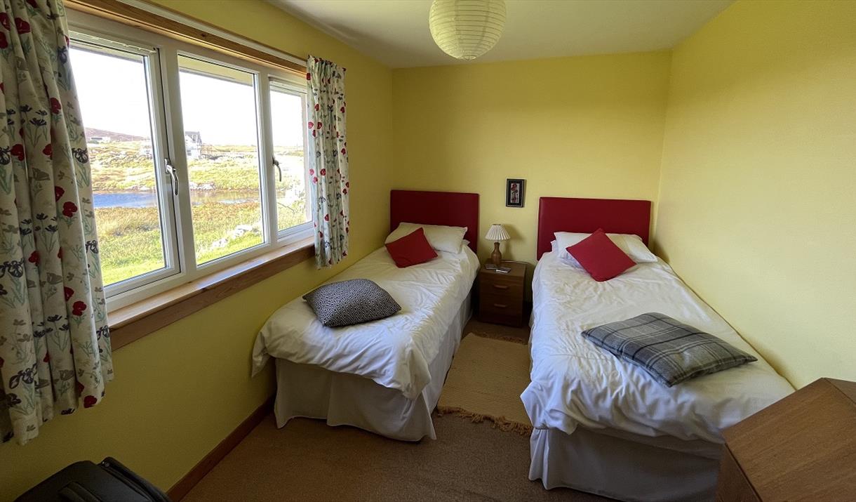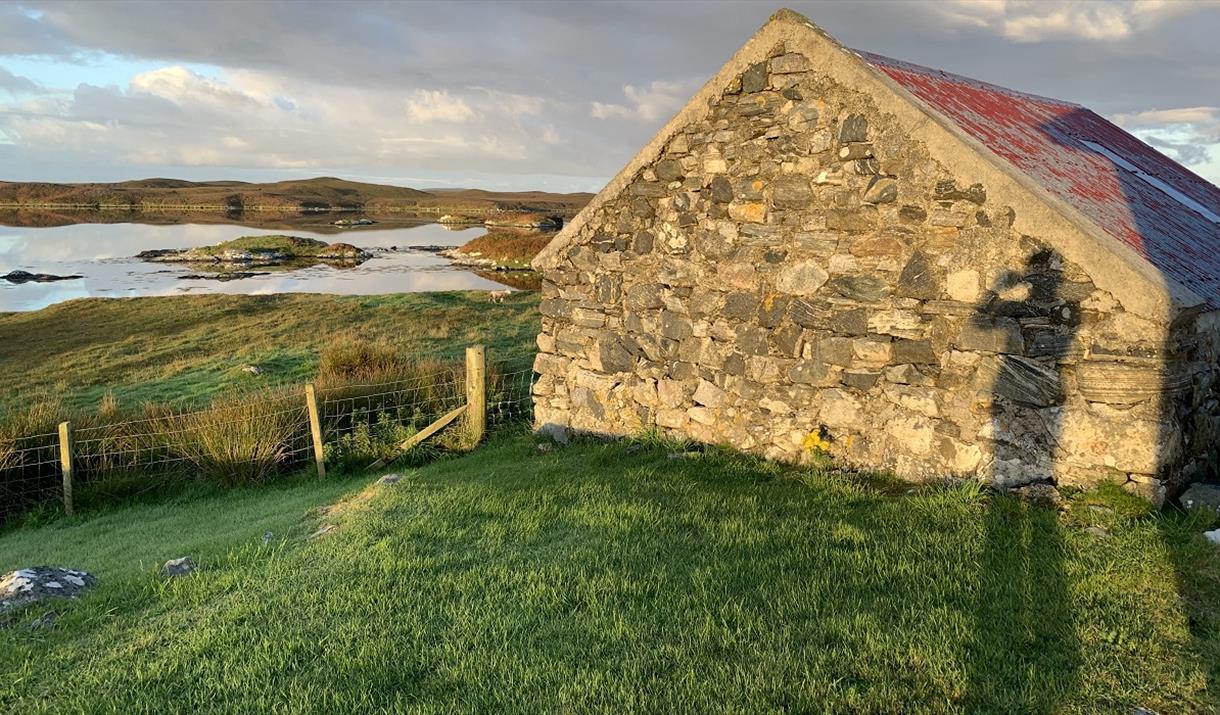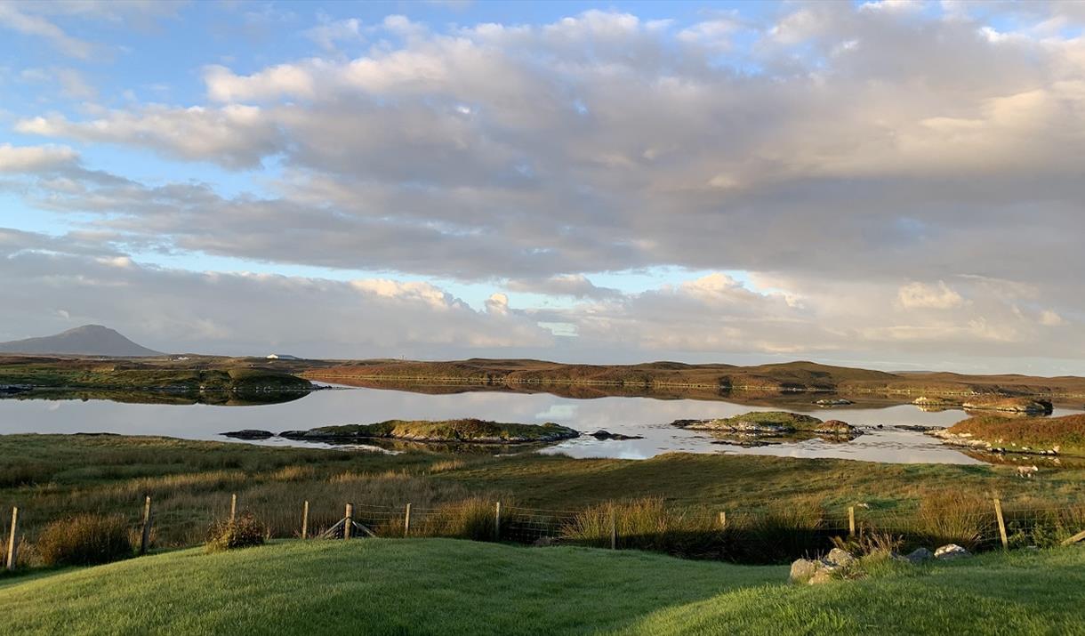 A warm and comfortable place to relax and enjoy walking,cycling and the local wildlife. The house was built in 1990 on the site of the crofthouse that my grandfather built in 1903. It is about 1 mile from the pier at Lochmaddy and is on an elevated site with wonderful views over Loch Strumore, North and South Lee and Eaval, the three highest hills on the island. Heating is by storage and panel heaters and there is an open fire as well. A huge variety of birds can be seen from the living room, including regular sitings of short-eared owl, hen-harriers and sea eagles.