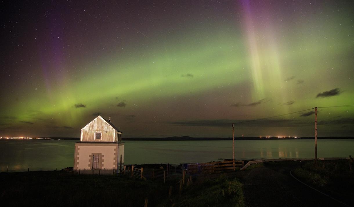 Built in 1900 to store the coal for the nearby Tiumpan Head Lighthouse, The Bunker’s foundations pay homage to its hardy past, accompanied with aluminum cladding with reflective capabilities that help blend The Bunker into the landscape. Through the entrance, you’ll find a westward facing bedroom hosting a super king-sized bed. A spacious, luxurious bathroom with a walk-in rainfall shower, designed impeccably with natural materials, textures and colours. The utility room is also situated downstairs, with space for muddy boots, as well as a washer and dryer. A spiral staircase leads up to an open plan kitchen and living space with windows encompassing the room, sliding glass doors and a reinforced glass balcony to accommodate the sweeping views. The kitchen comes fully equipped with everything you need for a self-catered stay, including a Nespresso coffee machine for your morning coffee. A wood burner centres the living space which offers cosy sofas, snuggly rugs, as well as a tv and a telescope for stargazing.