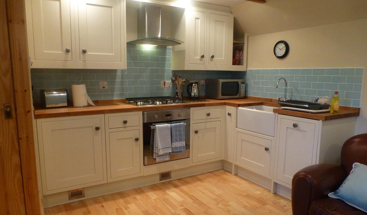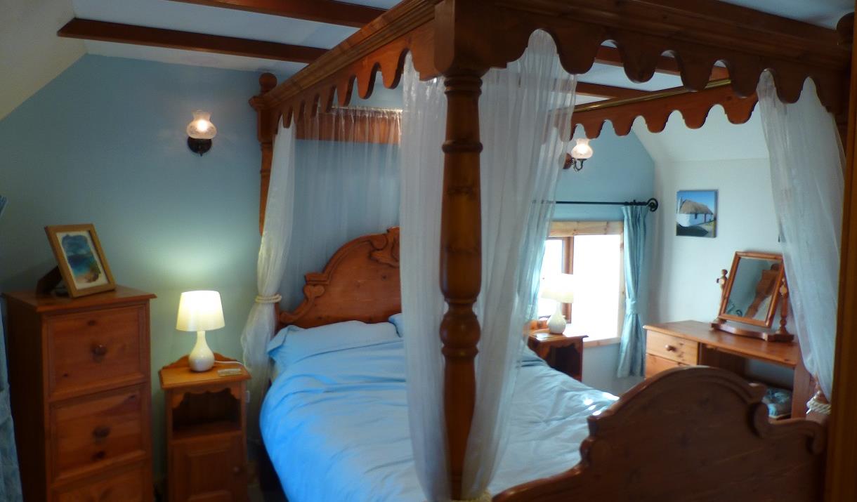 Internally the cottage has a bedroom with a 4 poster bed, bathroom with high pressure shower, living room with a fully equipped kitchen (including dishwasher) leather sofa and chair, TV with DVD, Bluetooth speaker, Wifi and a washing machine in the small shed behind the cottage. It is heated with modern electric panel heaters.