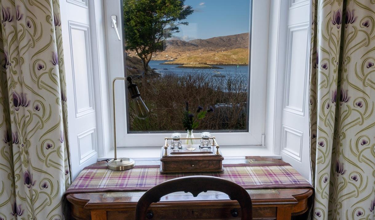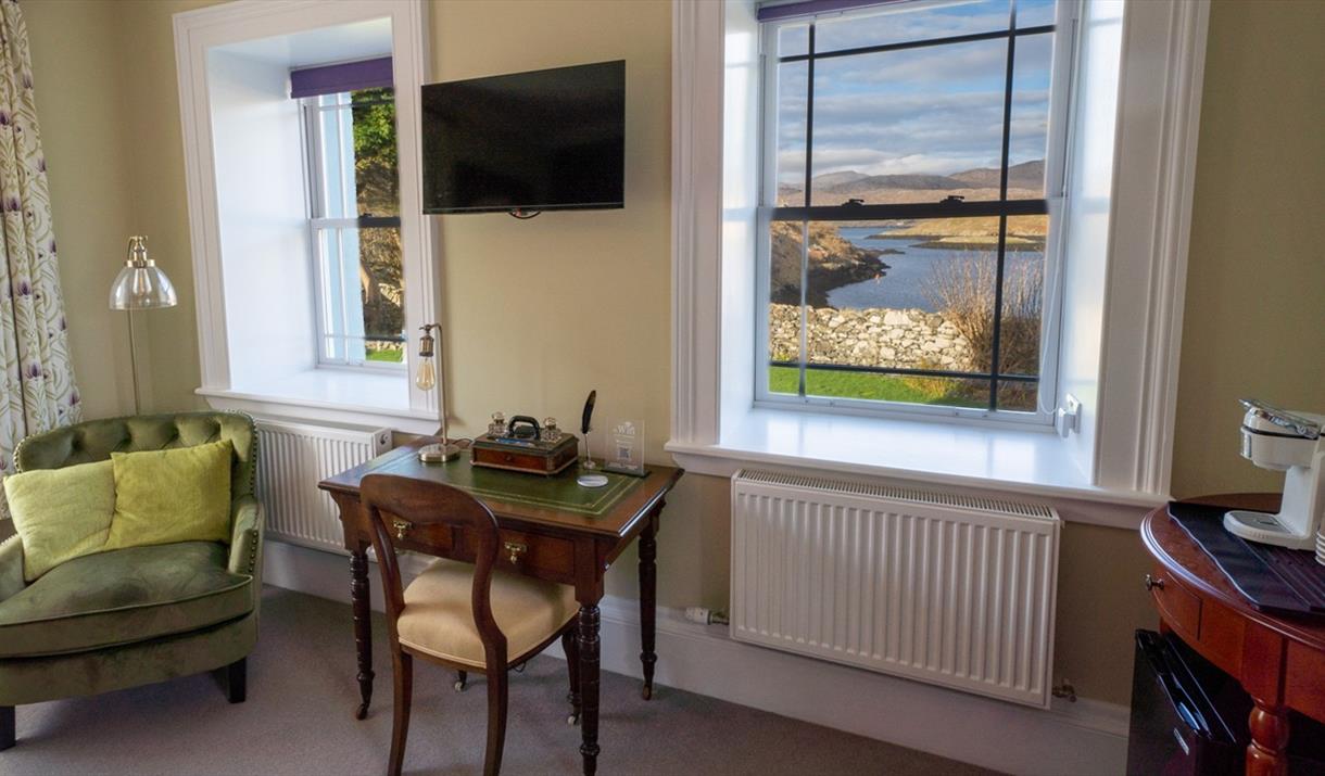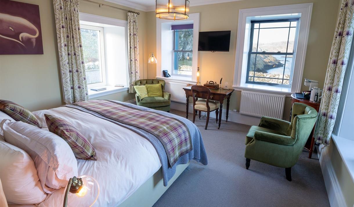 We have the very large Luskentyre Room with views to the north harbour and across to the Harris Hills, there is the Scarista room a large bright room, triple aspect including views over the north harbour and hills, and with an extra large shower room. Our third room Borve is just a little smaller (but still larger than most), with views over the front garden. All bedrooms are configurable as superkings or twins and all have fridges.