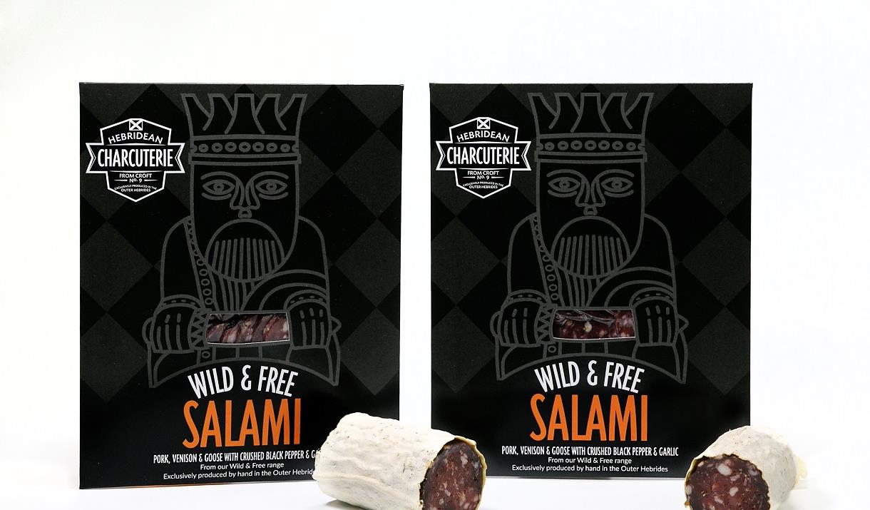 “Our Wild & Free Salami is handmade from ingredients sourced from across the Outer Hebrides; from wild deer and geese which roam the landscape, along with rare breed pigs from Islanders’ crofts. These fine quality meats along with crushed black pepper and garlic produce a rich in flavour, bold in taste, artisan salami which we think you will love.”