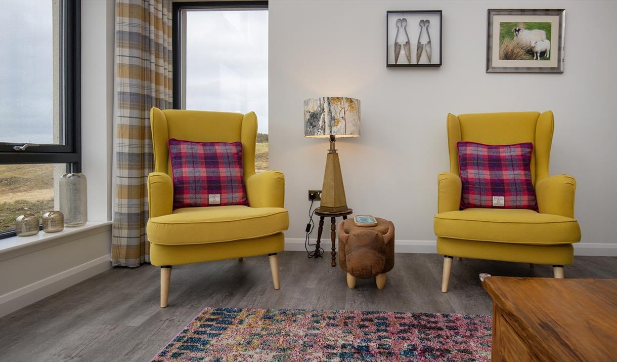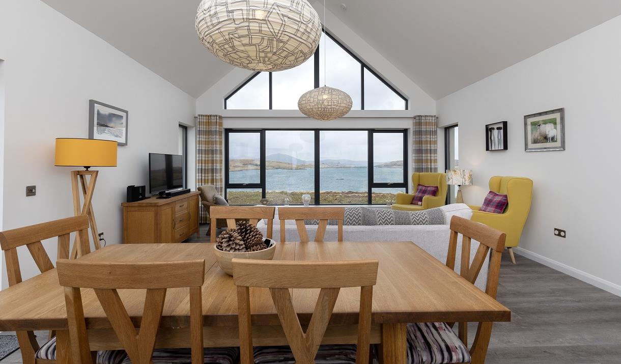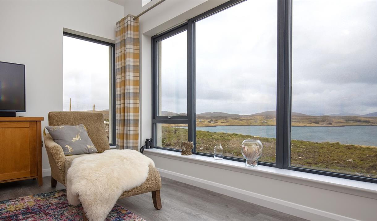 The lounge is the perfect place to unwind after your day exploring Lewis & Harris. It has a comfortable two seater sofa that looks directly over Loch Barraglom, as well as two arm chairs. The feature of the room is the luxurious chaise longue - perfect for an afternoon snooze or to just relax and enjoy the wildlife and sunsets.