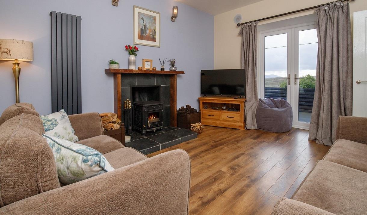 Double and twin bedrooms are located upstairs along with a small seating area for some quiet reading or just sitting back and relaxing. Both the lounge and dining room have patio doors leading to the fenced garden. There are two decked areas with patio furniture to allow ‘al fresco’ dining and behold the stunning sunsets and the elusive ‘merry dancers’ (aurora borealis).
