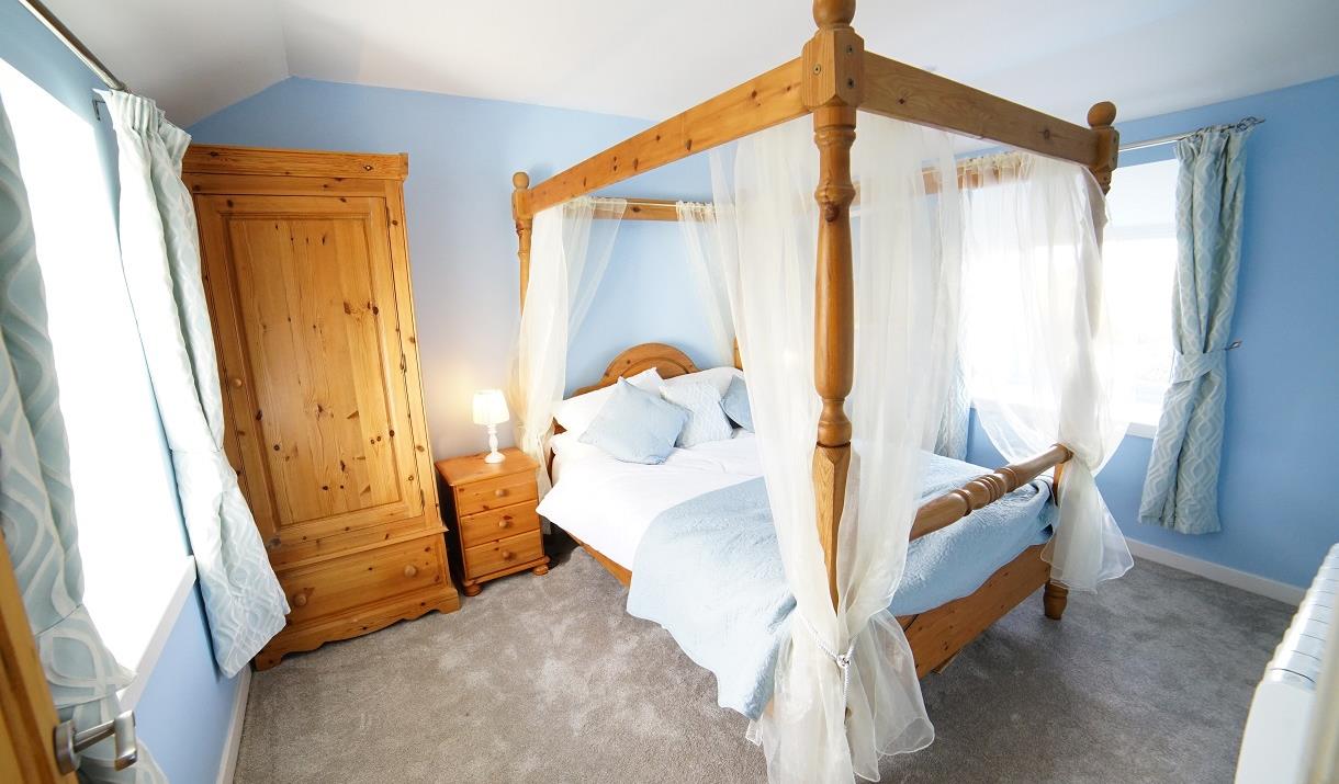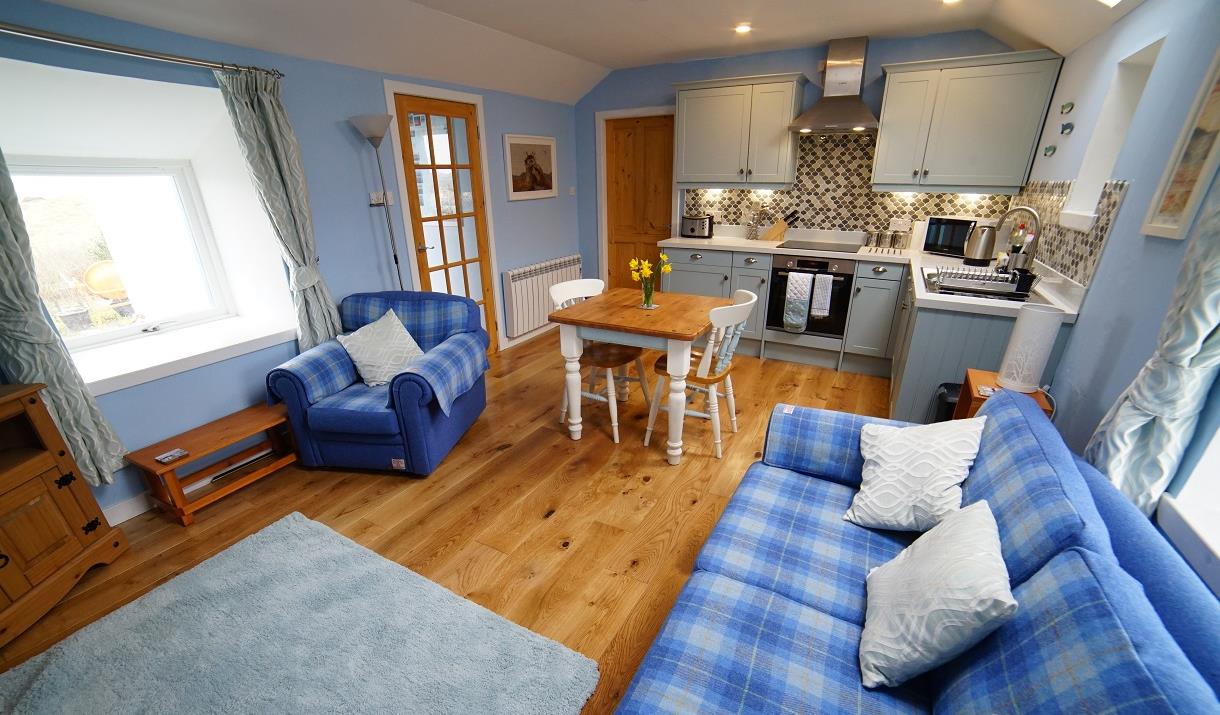 Internally the cottage has a bedroom with a 4 poster bed, bathroom with high pressure shower, living room with a fully equipped kitchen (including dishwasher), Harris Tweed sofa and chair, TV, DVD player, Bluetooth speaker, Wifi and a washing machine in the shed behind the cottage.