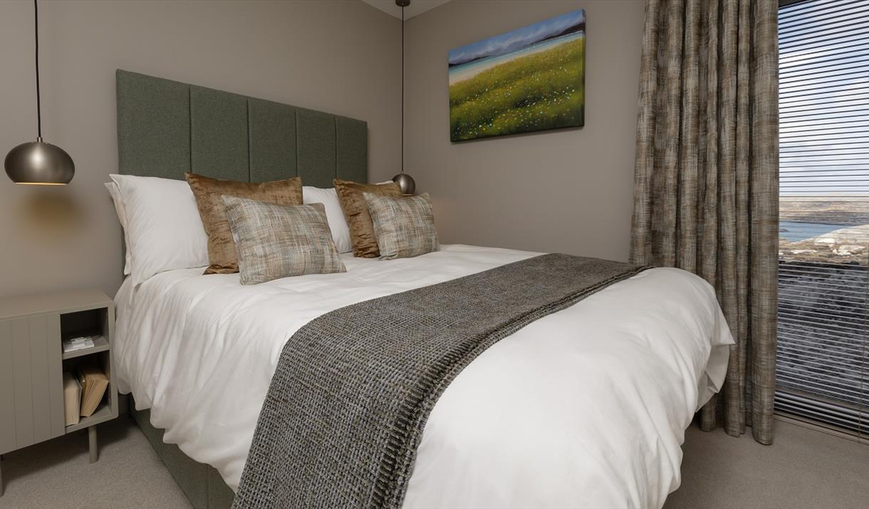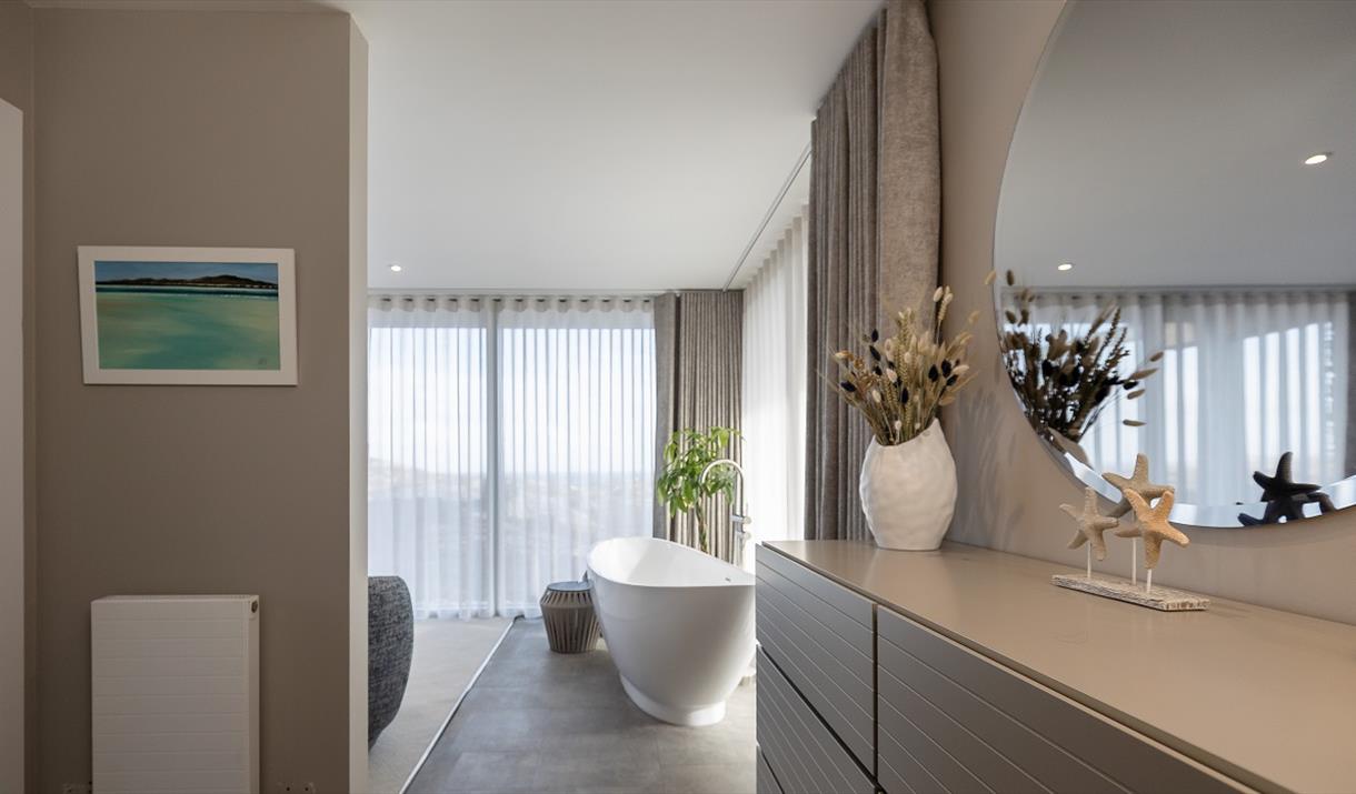 Baile An Or is built with three bedrooms on the ground floor. The master bedroom is a double bedroom with dressing area, freestanding bath and en suite shower room. The master bedroom has floor to ceiling windows with views towards Skye across the Minch.
