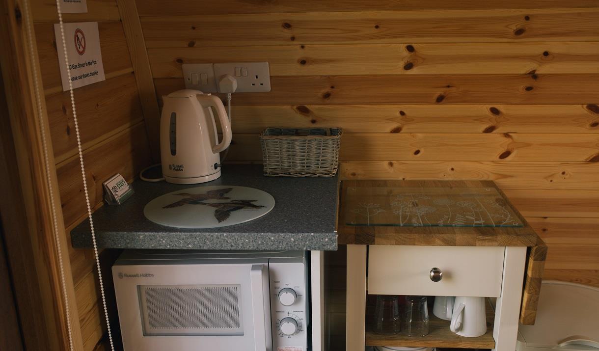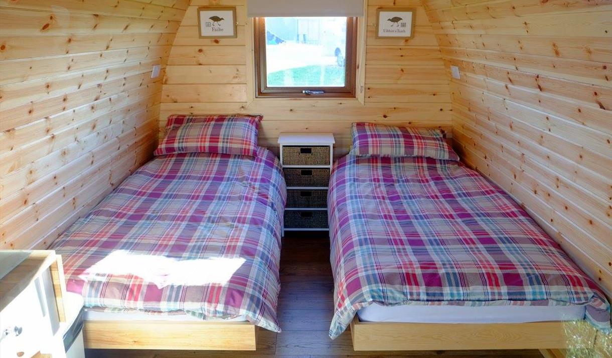 The Corncrake Pod sleeps 2 people in single beds. Well equipped with fridge, microwave, kettle, crockery and cutlery, electric heater, lighting and bed linen supplied.