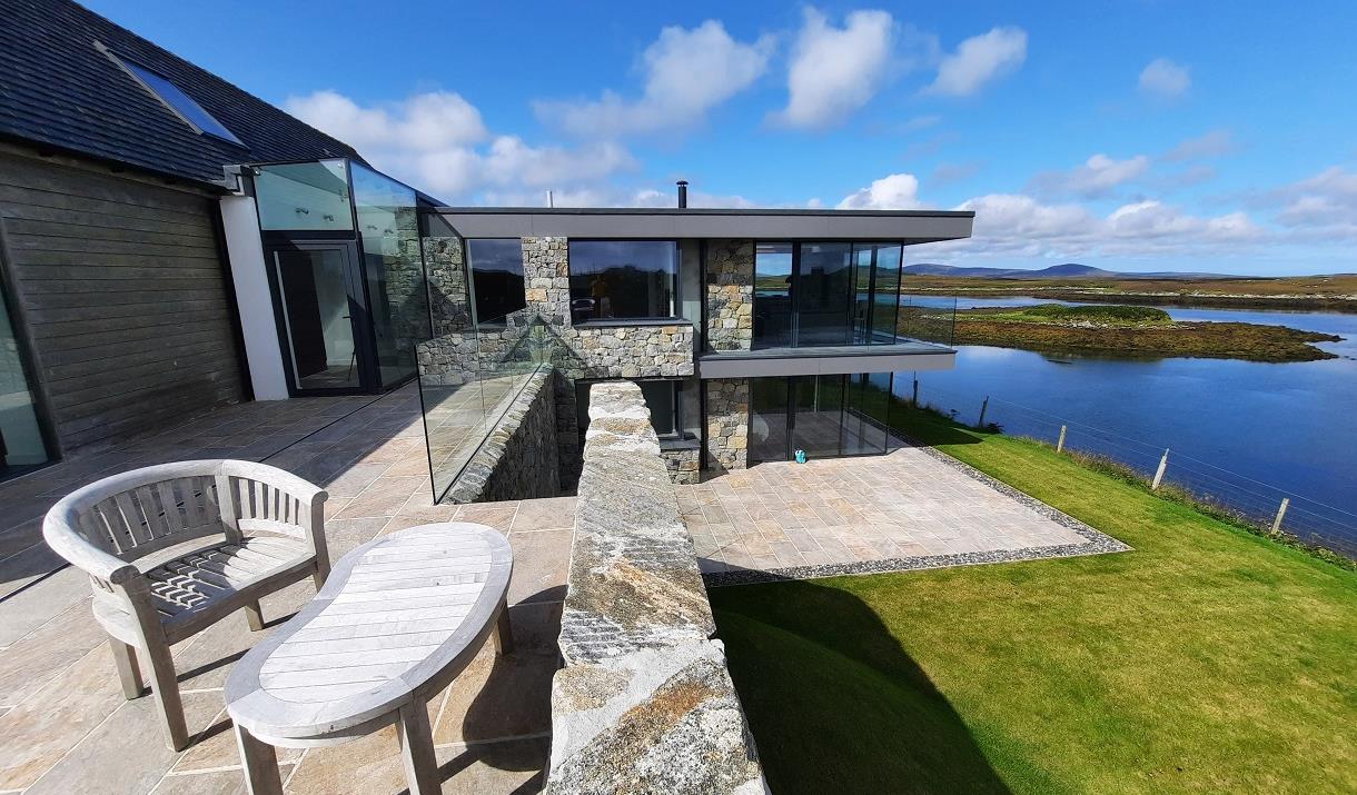 Built to a very high specification over a sea loch in North Uist the house has 4 bedrooms 3 Bathrooms with two large lounges which includes a TV and Hwam wood/peat burning stove in each. The housen has underfloor heating and electric blinds in the large granite and glass extension. There is a large bathroom with an Ashton and Bentley bath overlooking the loch. In the master bedroom there is a Harrison and Spinks Super King Bed