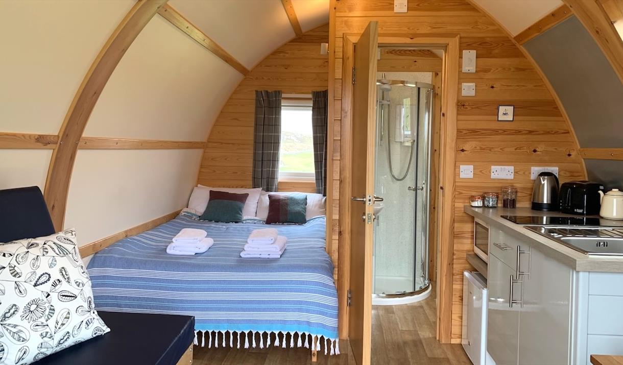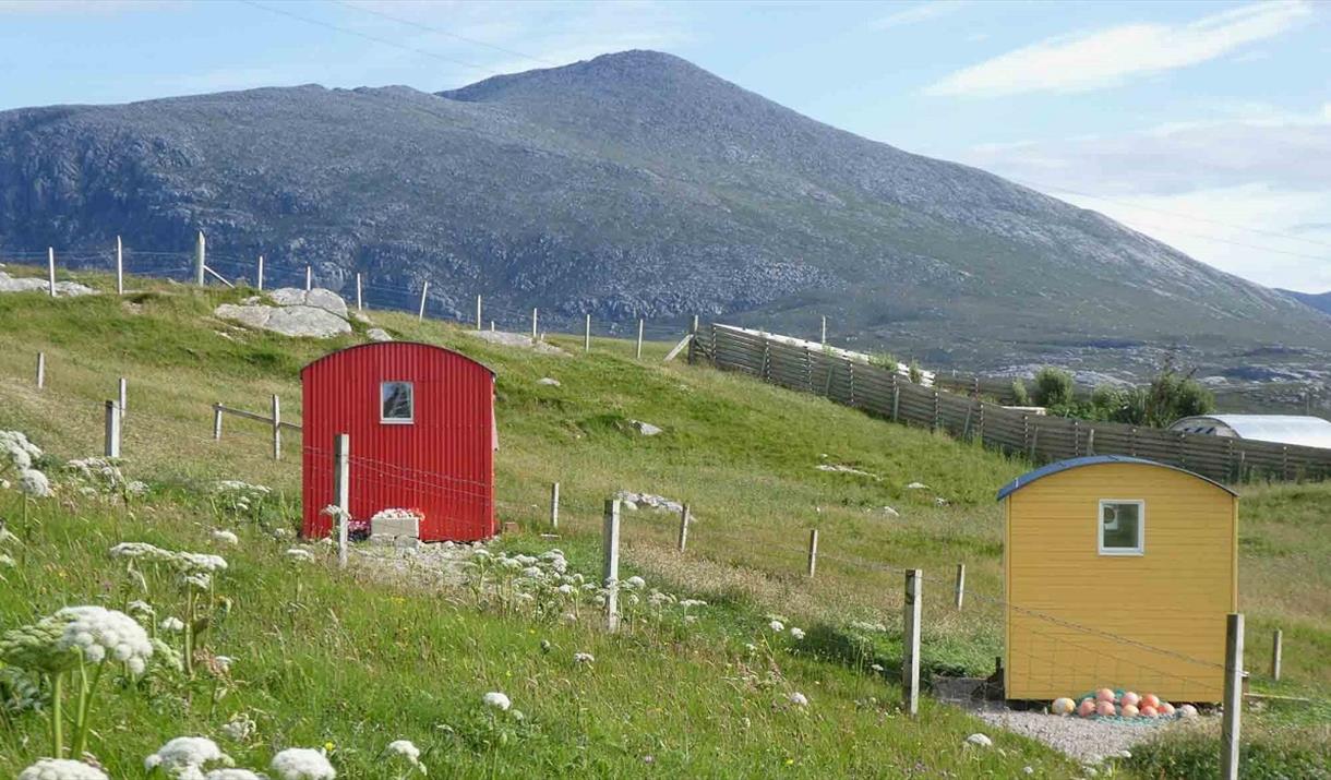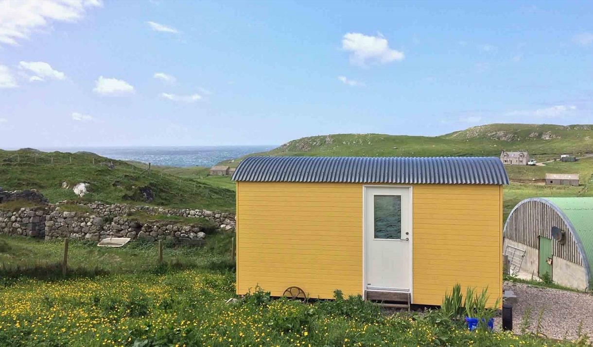 3 Wigwam® Holiday Cabins and 2 vintage style Shepherd’s Huts with ocean views, are fully self-contained with their own private en-suite showers/WC and kitchens equipped for self-catering. Each Wigwam® Cabin sleeps up to 4 adults on 1 double bed and 1 double sofa bed. Each Shepherd’s Hut sleeps up to 2 adults on one double bed. Fully insulated, with electric heating and double glazing, a luxury camping experience is guaranteed in any Hebridean weather. Mangersta Croft Holidays is a dog friendly Glamping site and can offer group accommodation for a total of 16 people.