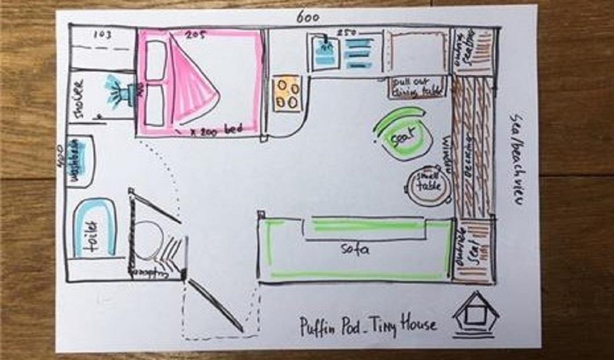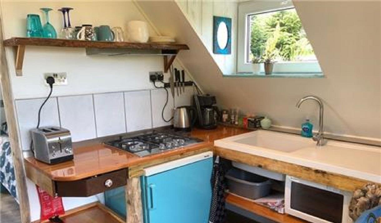 The Tiny House's include: small kitchen with 4 gas-hob, combi microwave/oven, kettle, toaster, fridge, cutlery, crockery, pots, pans. It has a good quality bed 140x200cm, en-suite shower room with wash-basin/toilet good shower. Enjoy lovely sunsets at the beach, or gaze from your panoramic window. The house is tastefully designed with artwork and driftwood.