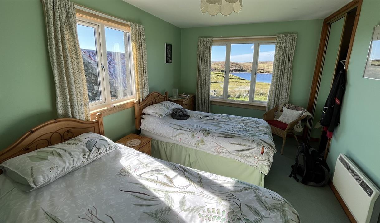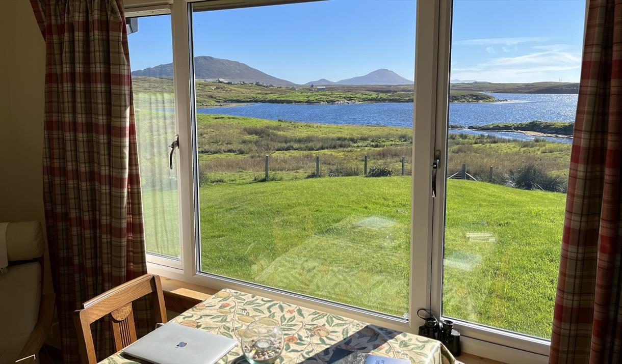 A warm and comfortable place to relax and enjoy walking,cycling and the local wildlife. The house was built in 1990 on the site of the crofthouse that my grandfather built in 1903. It is about 1 mile from the pier at Lochmaddy and is on an elevated site with wonderful views over Loch Strumore, North and South Lee and Eaval, the three highest hills on the island. Heating is by storage and panel heaters and there is an open fire as well. A huge variety of birds can be seen from the living room, including regular sitings of short-eared owl, hen-harriers and sea eagles.