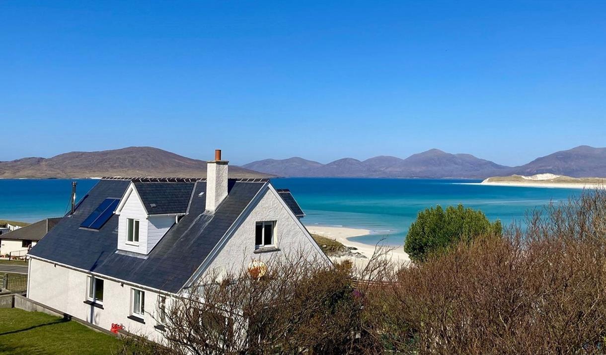Set in a rare beachside location in the Outer Hebrides, Tarasaigh House boasts spectacular views across the white sands of Seilebost, stretching toward the breathtaking Luskentyre Beach and the dramatic peaks of North Harris. It is the perfect base for exploring the striking sandy beaches and hiking through the rolling hills of West Harris. As you unwind in the garden or on the terrace after an adventurous day out, the shimmering, ever-changing hues of the lagoon unfold just below you.
