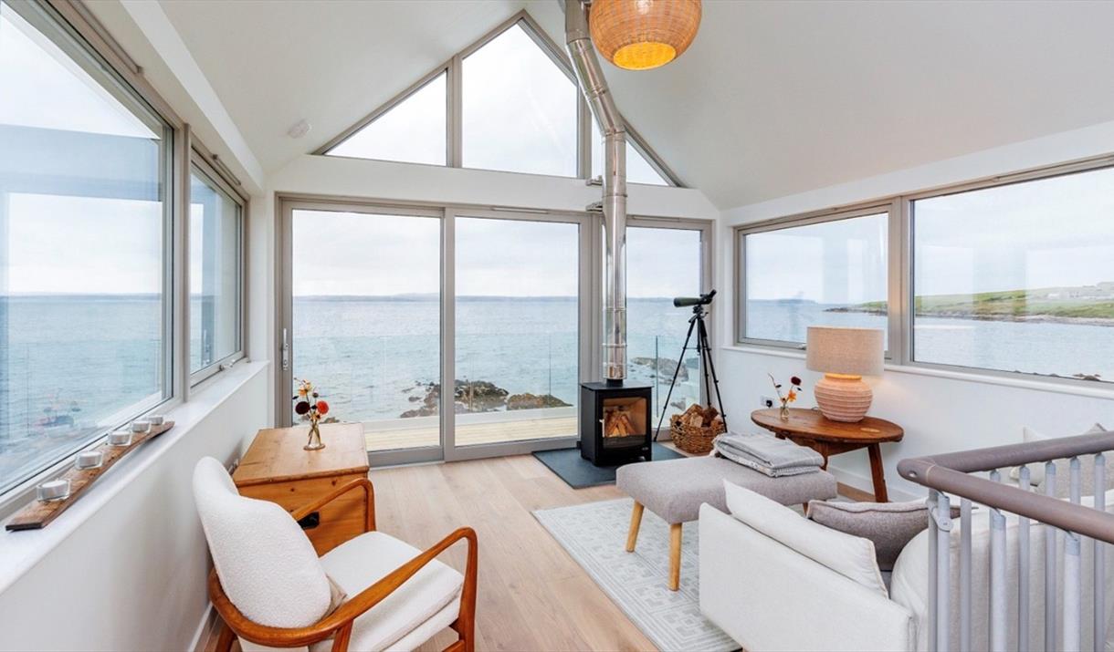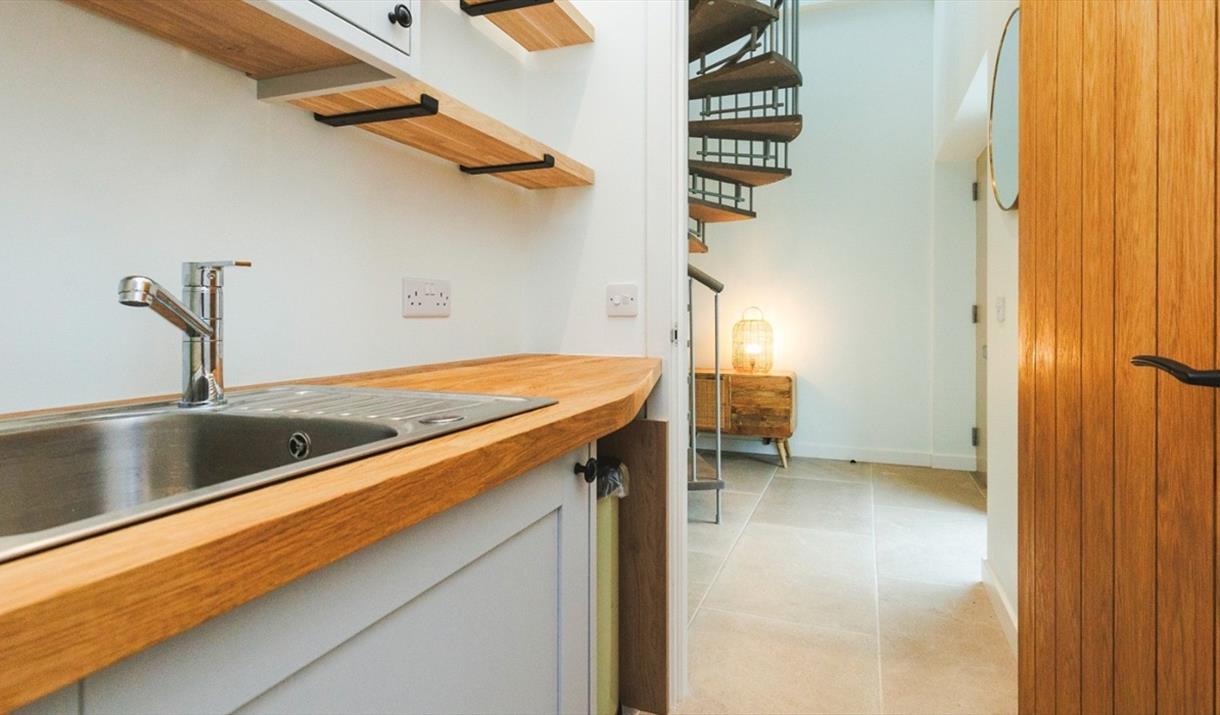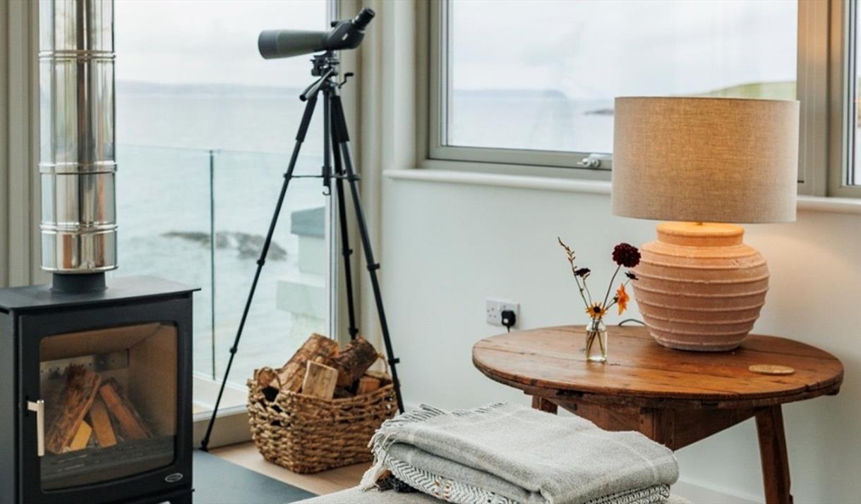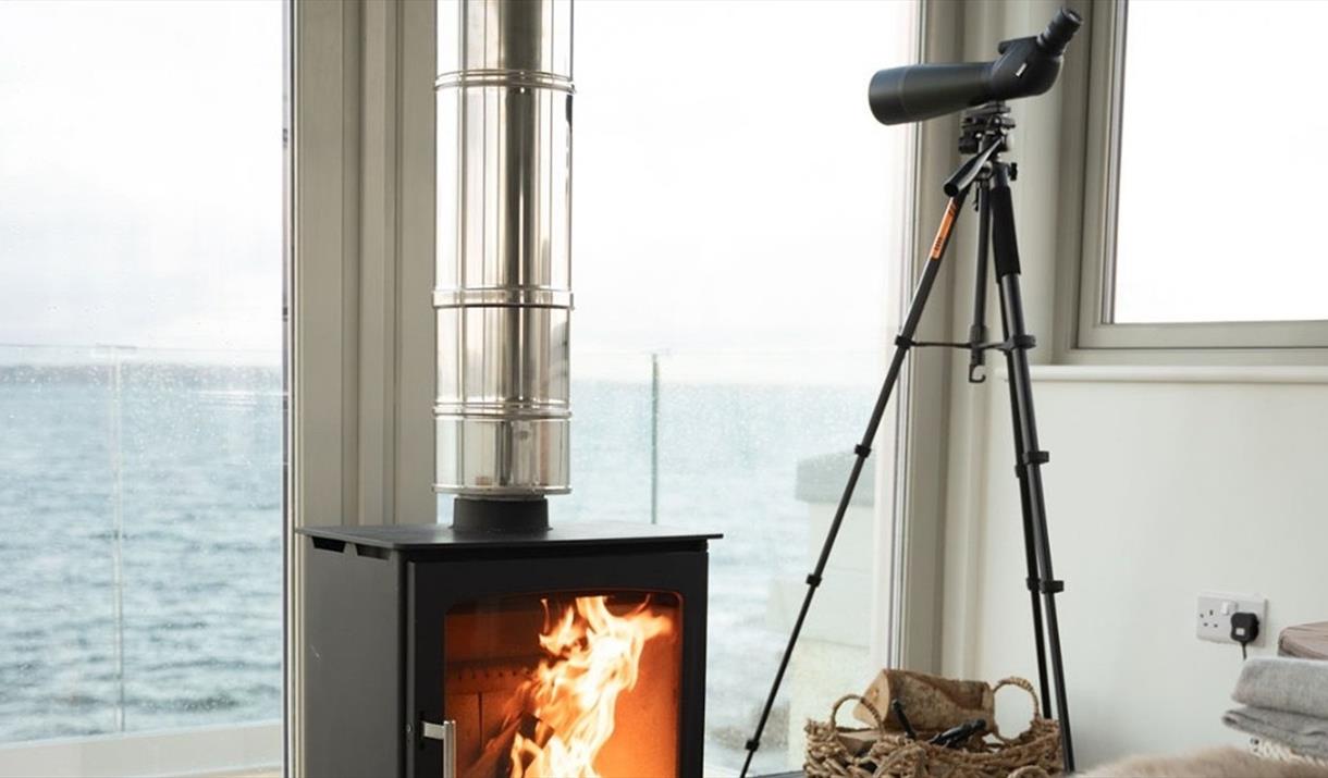 Through the entrance, you’ll find a westward facing bedroom hosting a super king-sized bed. A spacious, luxurious bathroom with a walk-in rainfall shower, designed impeccably with natural materials, textures and colours. The utility room is also situated downstairs, with space for muddy boots, as well as a washer and dryer. A spiral staircase leads up to an open plan kitchen and living space with windows encompassing the room, sliding glass doors and a reinforced glass balcony to accommodate the sweeping views. The kitchen comes fully equipped with everything you need for a self-catered stay. A wood burner centres the living space which offers cosy sofas, snuggly rugs, as well as a tv and a telescope for stargazing.