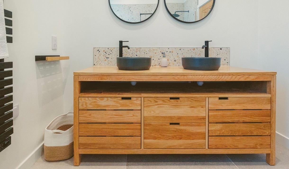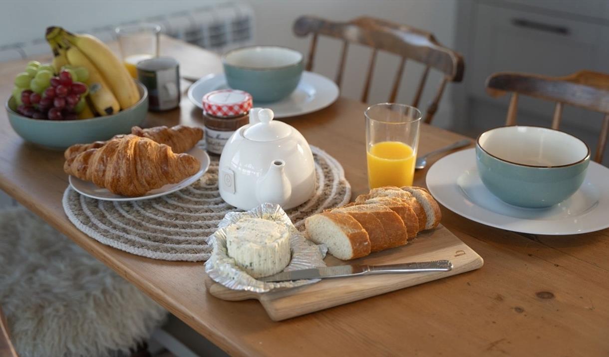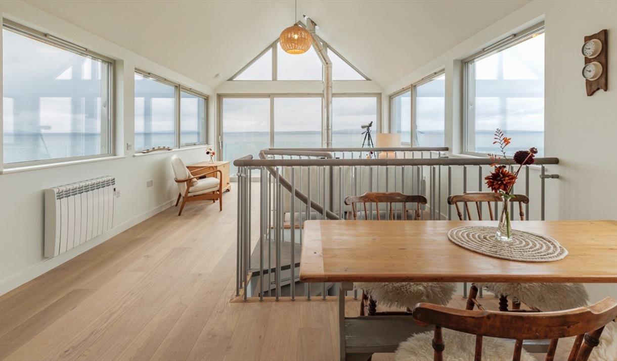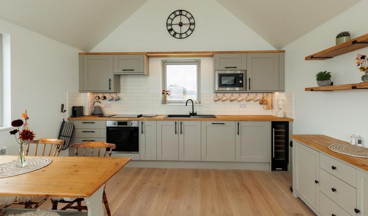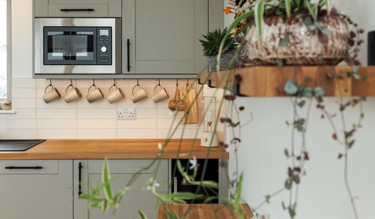 Through the entrance, you’ll find a westward facing bedroom hosting a super king-sized bed. A spacious, luxurious bathroom with a walk-in rainfall shower, designed impeccably with natural materials, textures and colours. The utility room is also situated downstairs, with space for muddy boots, as well as a washer and dryer. A spiral staircase leads up to an open plan kitchen and living space with windows encompassing the room, sliding glass doors and a reinforced glass balcony to accommodate the sweeping views. The kitchen comes fully equipped with everything you need for a self-catered stay. A wood burner centres the living space which offers cosy sofas, snuggly rugs, as well as a tv and a telescope for stargazing.