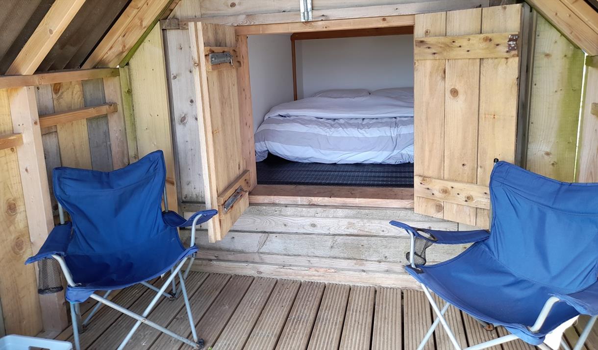 All our pods are fully insulated and very cosy. Our double pods have very sturdy turf roofs with porches, camping chairs and fire pits – all have their own distinctive views of nature, the sea, distant mountains, and islands. Perfect for relaxing and watching the world go by.