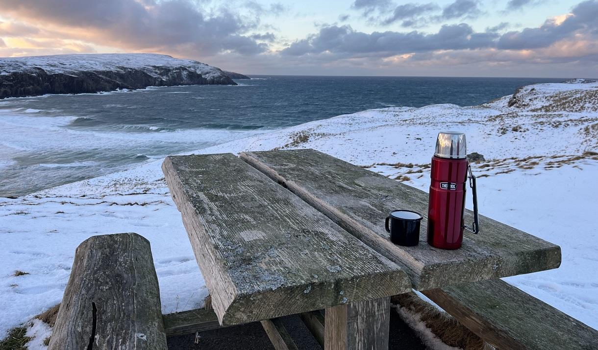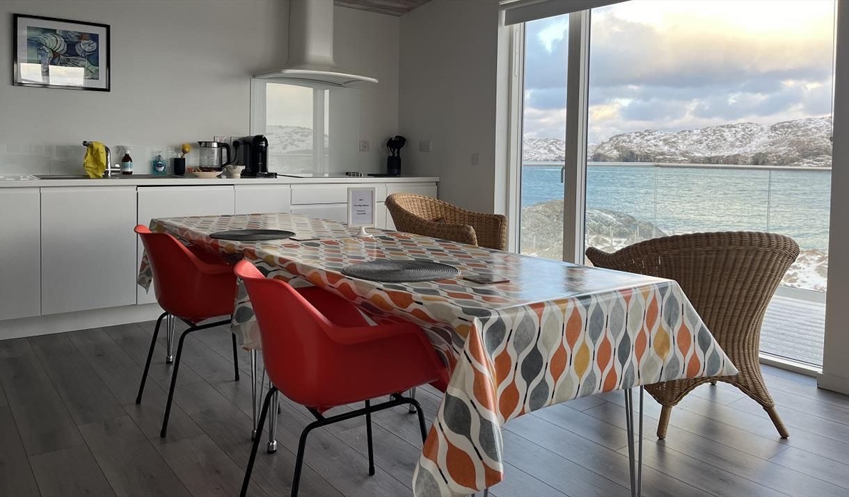 The dining area, as well as having a large table with two comfortable chairs for dining, also has two wicker chairs with Harris tweed cushions where you can sit with your morning coffee/tea watching the wildlife, the sea and the big skies. We provide ground coffee for the cafetière and a Nespresso machine (with a selection of recyclable vertuo pods) as well as a selection of teas (caff / decaff) which should set you up for the day ahead.