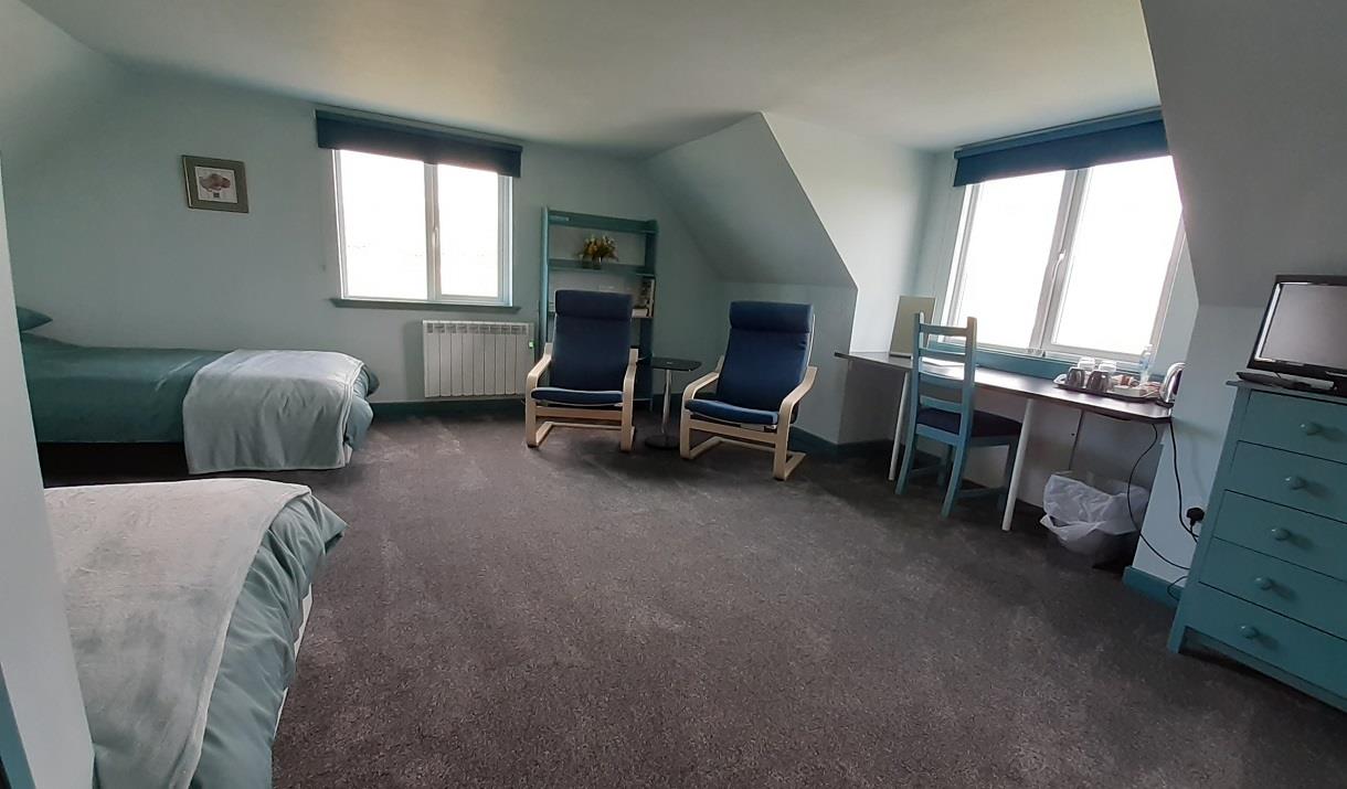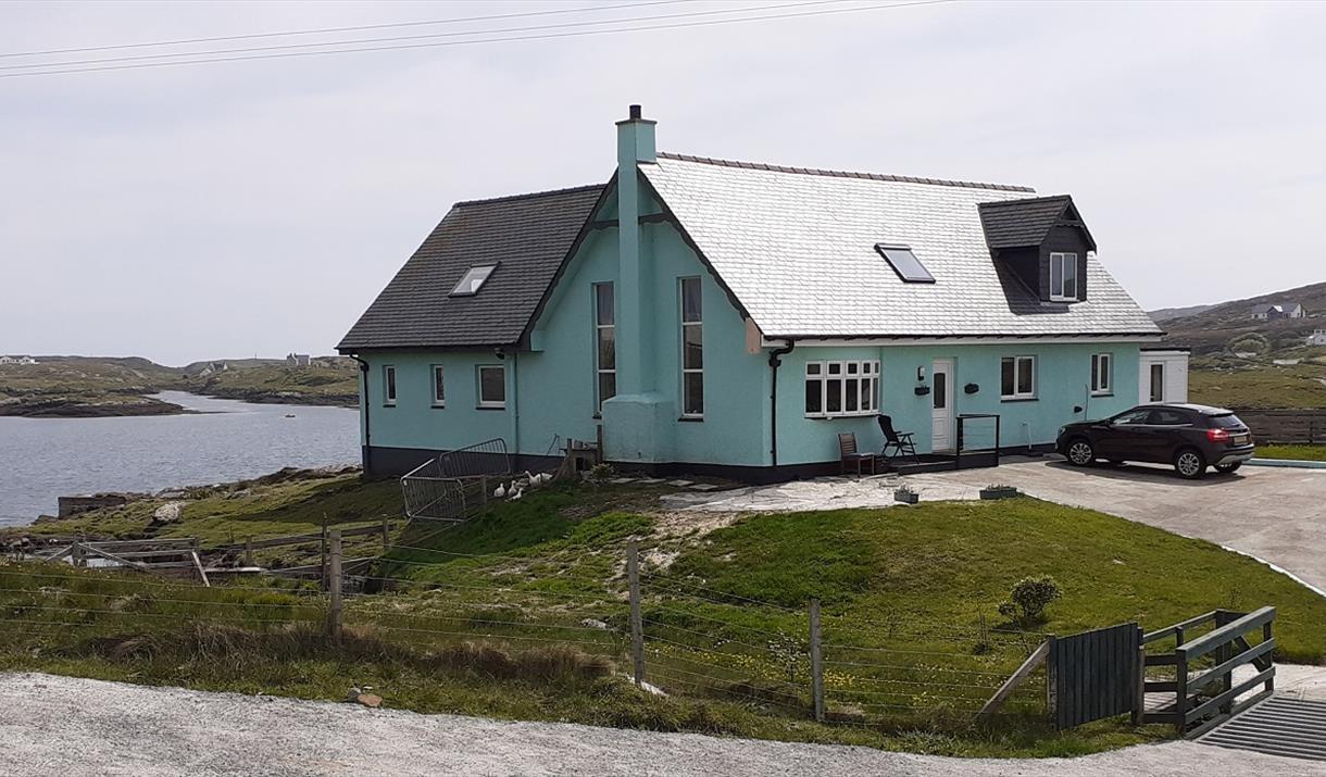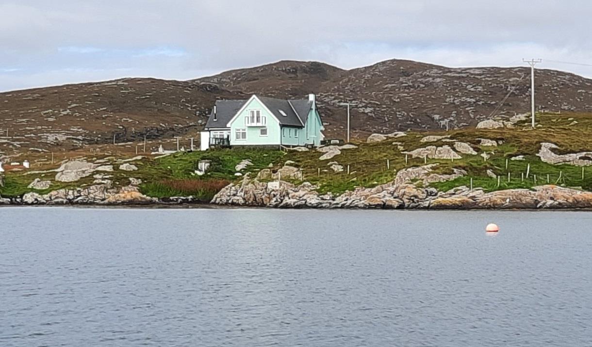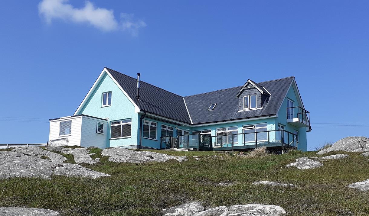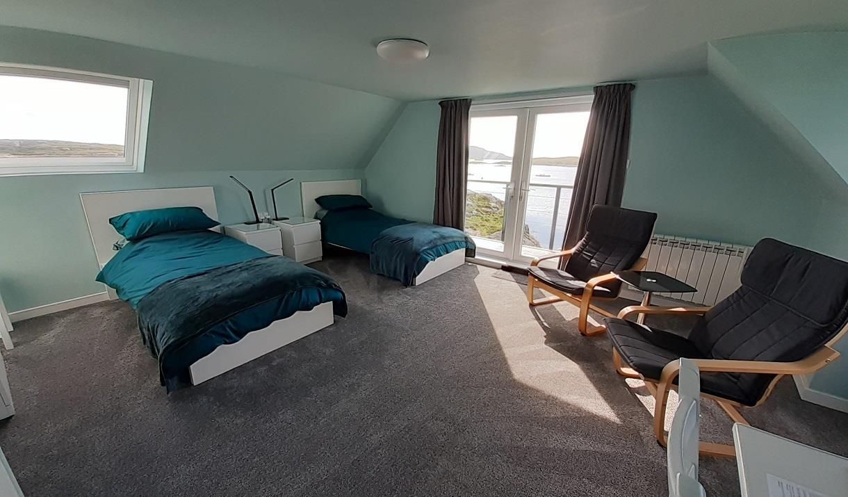 We have two spacious twin-bedded rooms, one with a balcony. Both have en-suite bathrooms. A large well-appointed lounge is also available exclusively for our guests' use. Cooked and continental breakfast is included. Home-made soup and a varied cheeseboard is available in the evening. Packed lunches can be provided by arrangement. We are situated by the shore in the north of the island, with gorgeous views over the sea and Bruenish. We are 2 miles from the Eriskay ferry and 2 miles from the Airport. We are also very convenient for the Hebridean Way. Free Wifi, TV and parking. Tea and coffee facilities; shampoo and hairdryers in the rooms. Sorry, no pets. Transfers to and from airport can be arranged.