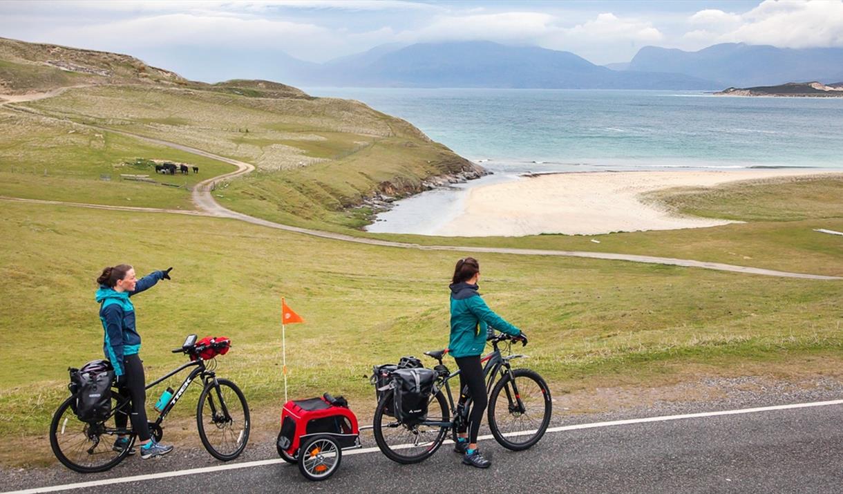 After the ferry ride across the Sound of Harris, where you may catch sight of seals basking on the skerries, the route heads up the west side of South Harris with magnificent views out across sandy beaches to Taransay and the North Harris Hills. You will definitely want to linger awhile perhaps stopping off for a bite to eat at Talla na Mara. There are plenty of places to get down onto the beaches, but if you turn off the main road and ride down to Luskentyre, you will come to Tràigh Rosamul, which is perhaps the most famous with fine views and equally fine toilets.