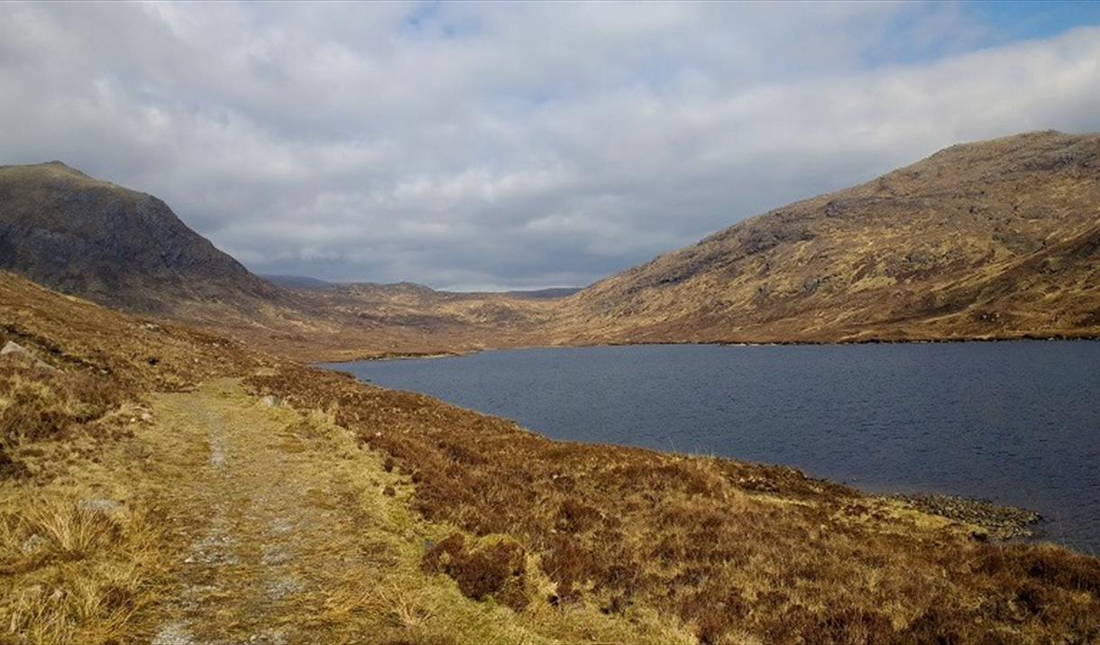 - Shortly after crossing a cattle grid leave the road following a good path that descends quickly to the shore of Lochannan Lacasdail, the large freshwater loch in front of you.