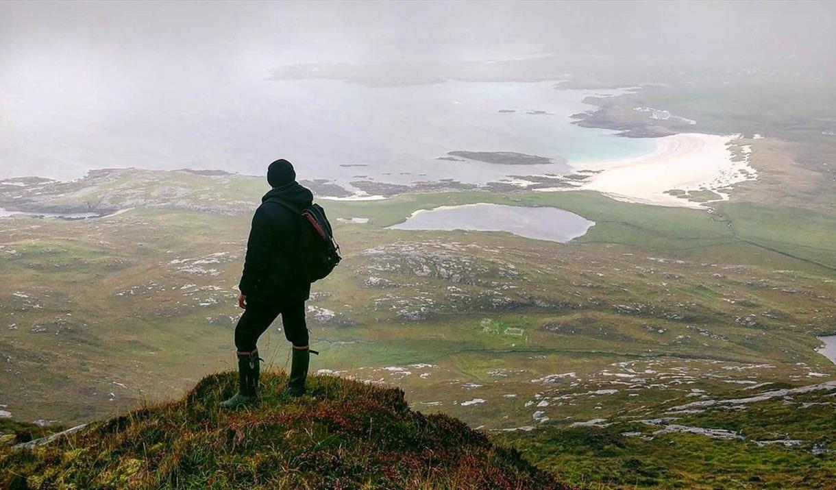 The walk begins and ends at the gate across the road from the telephone kiosk at Tangasdale - approximately 1.7 miles / 2.75km west from Castlebay on the A888. There is an area near the gate which is suitable for parking. The walk leads out as far as Dun Ban, an Iron Age fortification approximately 2,000 years old. Other historical and archaeological sites to be seen are a 15th century tower, an 18th century settlement area and a 4,000 year old Bronze Age burial cairn.