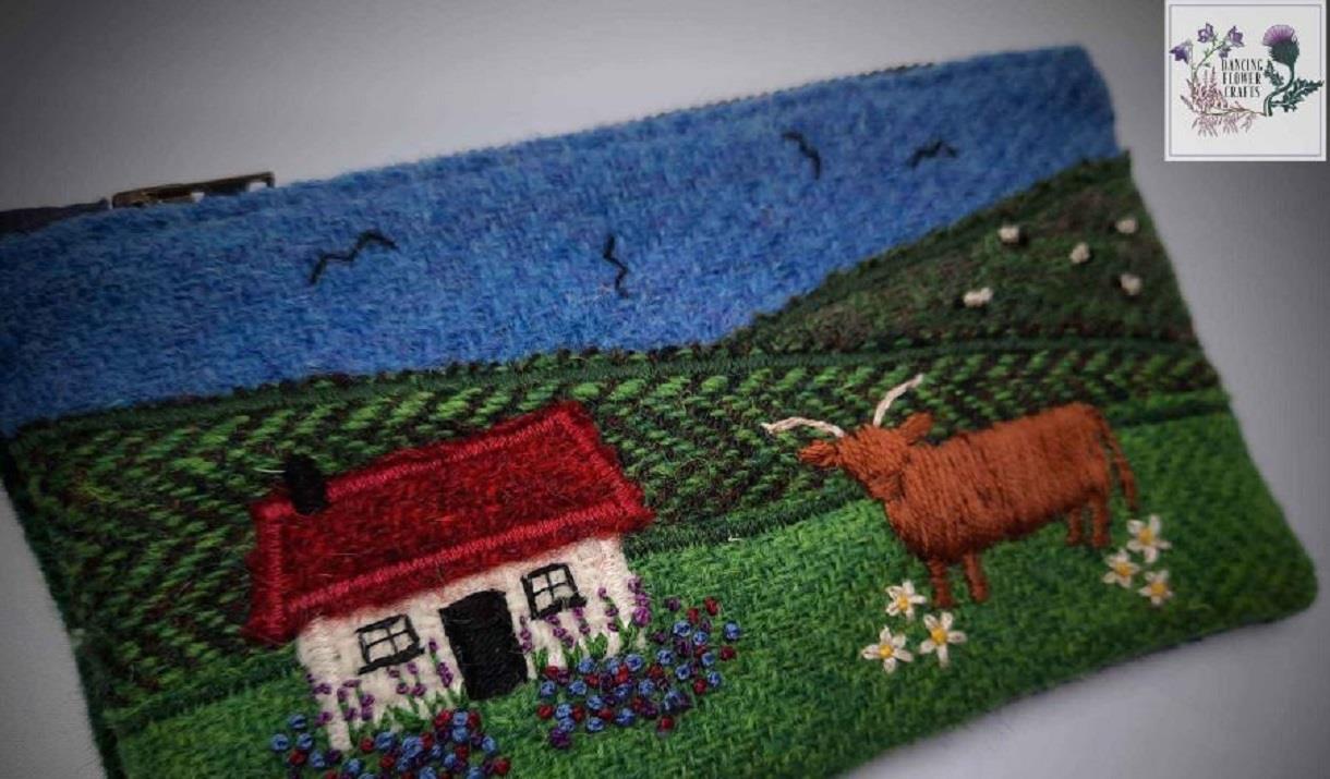 Harris Tweed® is a spectacular and special cloth, and I visiting the weavers to select my latest Tweed for my crafts gives me even more inspiration to design and make a range of arts and crafts.I hand embroider designs on to the Harris tweed® and use spectacular lining fabrics to compliment the design.