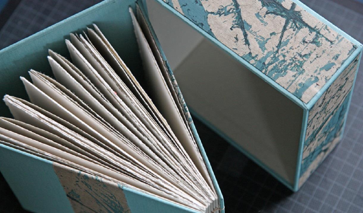 My books and boxes are made employing traditional bookbinding techniques which I love adhering to closely. I do however also want to give my work its very own style and feel. I hand craft the decorative paper I use to cover the objects I make. It is effectively a paper batik. Many layers of ink, dyes and wax ensure a rich and deep texture which at times is evocative of sea, sand and rock patterns and at other times a mere aesthetic expression. The wax is ironed out at the end of the process leaving the paper with a very tactile quality to it. This makes my books and boxes attractive and sturdy at the same time.