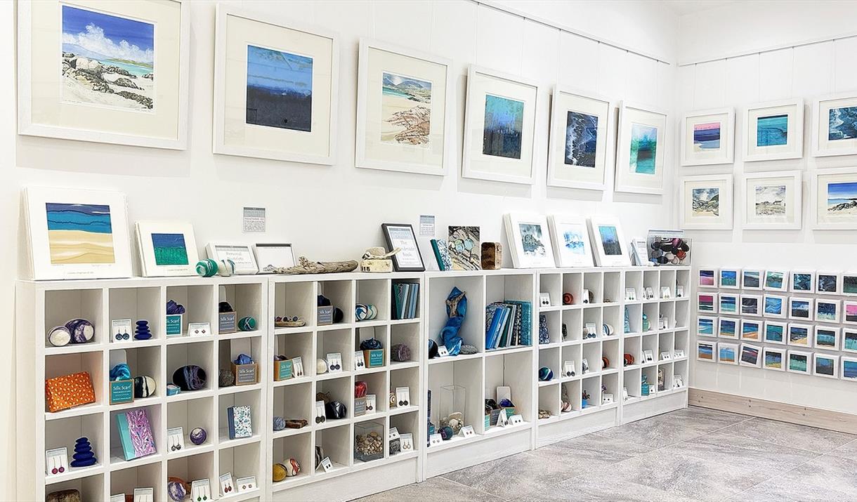 A beautiful little gallery situated just above the sandy beach at Dalbeg, on the west side of Lewis. Original watercolours, acrylics, silks, and pen & inks, giclée prints, and greetings cards, as well as jewellery, silk scarves, handmade journals, and other crafts, inspired by Harris, Lewis, and St Kilda, and all handmade by resident artists, Lesley and Alisdair Wiseman. Open most of the year, Monday to Saturday, 1pm - 5pm, and at other times by appointment.