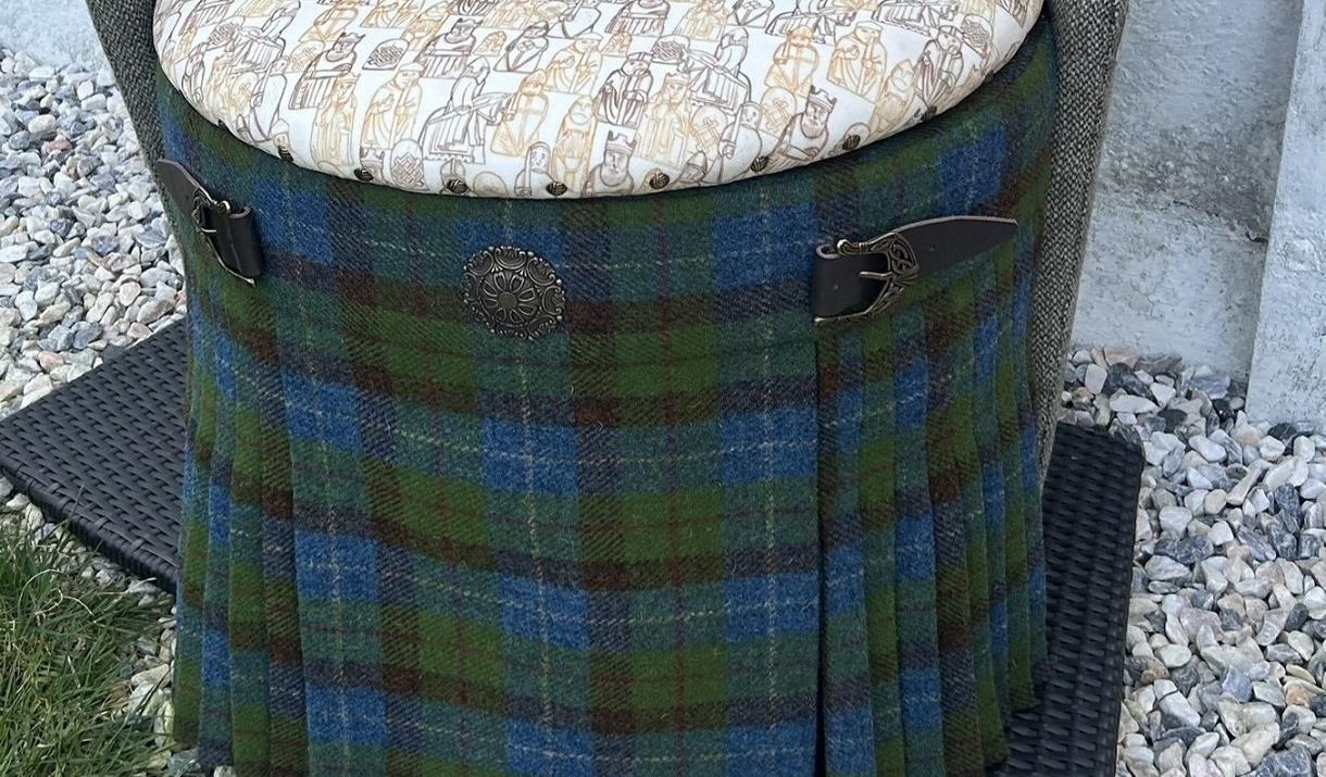 The infamous icons of the Hebrides inspired the design and creation of our handmade chair from a whisky barrel. This chair is a celebration of the most famed of these icons. The staves at the back of the chair represent the mythical and majestic Neolithic Callanish stones. A remnant of prehistoric religious activity or an astronomical observatory that does not cease to inspire and fascinate visitors today. The seat is imprinted with the mysterious archaeological treasures of the famed Lewis chessmen which were uncovered on the sands of Ùig beach on the Isle of Lewis (Eilean Leòdhais) in 1831. They were believed to have travelled across the seas from Norway in the early 13th century. The glass rest is turned from wood sourced in the Stornoway Castle grounds. These outstanding woodlands contain a varied and rich collection of trees, a rarity on the island. The whole chair is covered in the world-renowned Harris Tweed and fashioned into a kilt at the front. A cloth whose smell so distinct transports me back to my youth where I made the bobbins in my father’s loom shed where he created the big tweed 'an clò-mòr'. A cloth whose rich history is woven into the landscape, its heritage, and a people`s struggle.