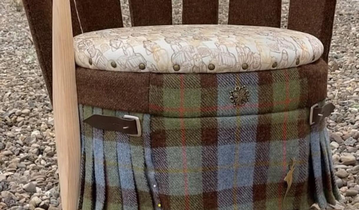 The first chair we made won an award and was sourced from the Abhainn Dearg whisky distillery in Ùig. Pushing the kilt front aside a cupboard can be discovered which you can use as a drinks cabinet or other storage. All these inspirational elements both ancient, historical, and new are a celebration of the Spirit of the Hebrides, its icons, its history, and its people.