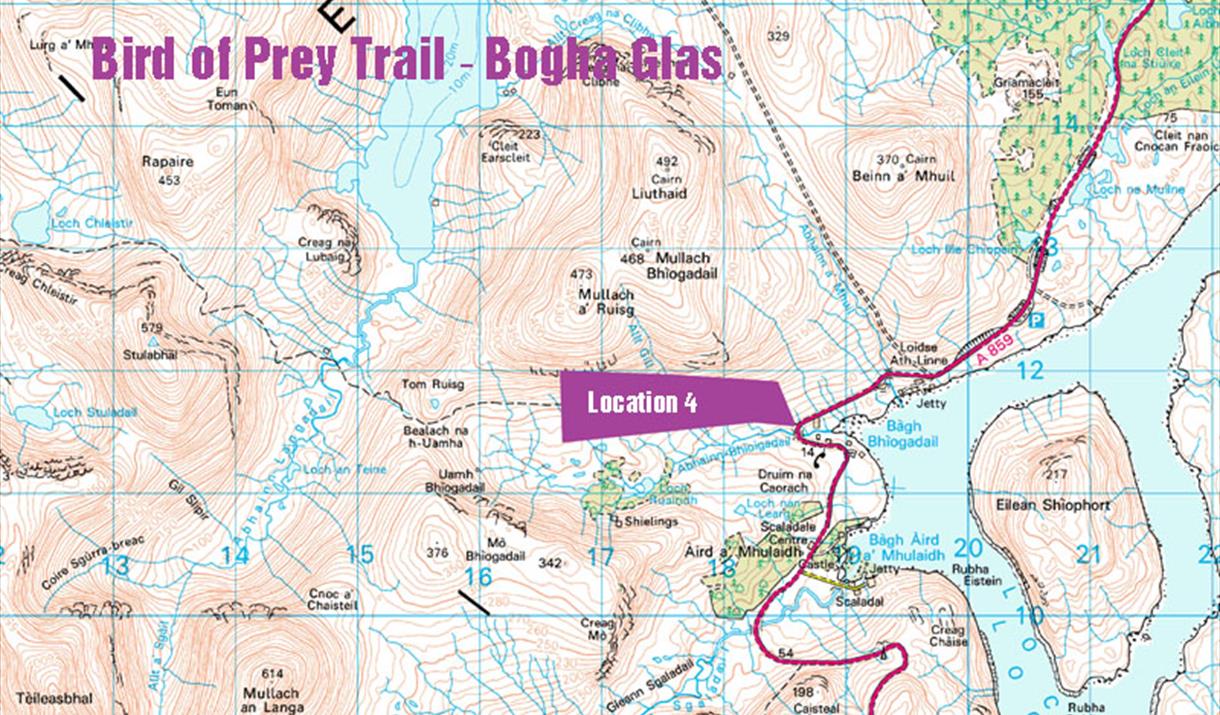 The Car park is adjacent to the A859, 1 mile South of the Lewis/Harris border. From the South, Bogha Glas is 1 mile North of the Scaladale Outdoor Centre and 12 miles from Tarbert.