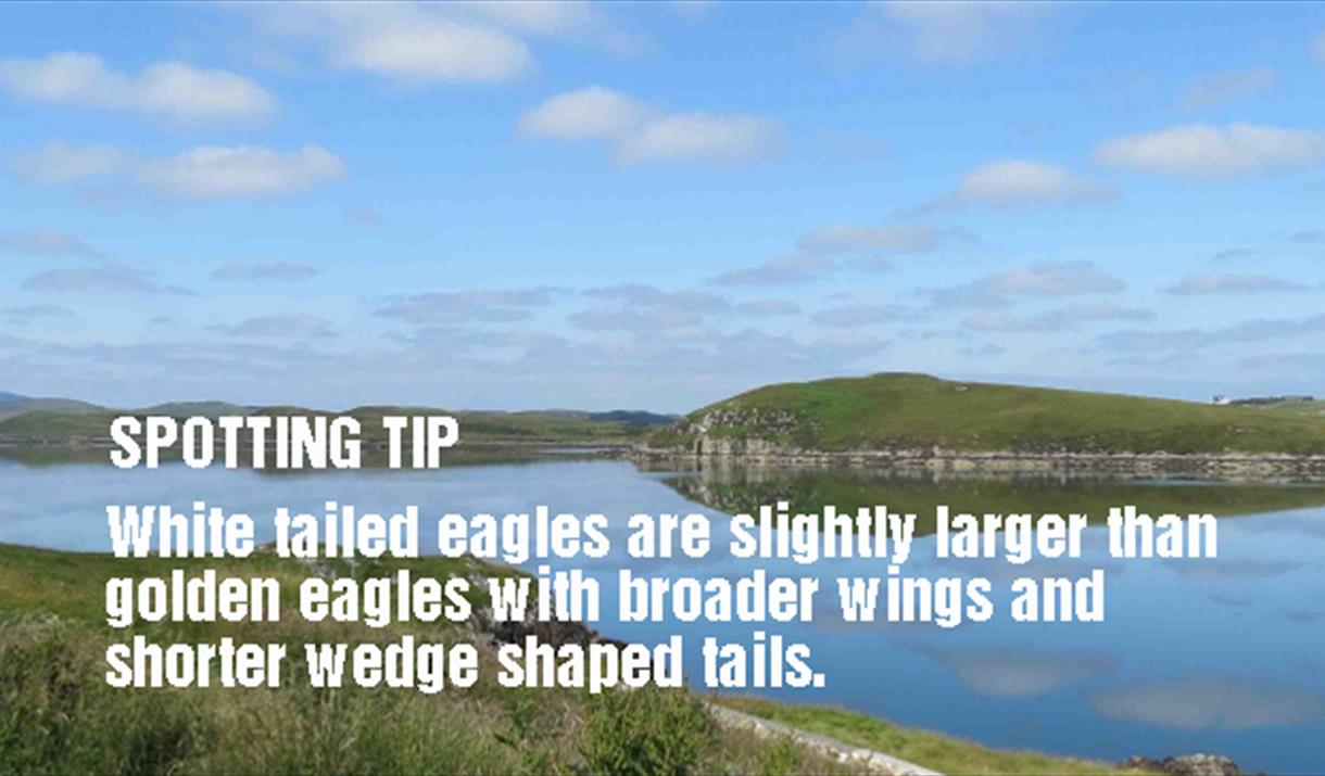 an easily recognisable ‘mewing’ call. Both eagle species are much larger with longer and broader wings. They flap less frequently and more slowly than buzzards and spend much of their time soaring and gliding. Golden eagles have long elegant wings and tail and are usually seen over remote moorland areas. White-tailed eagles are slightly larger than golden eagles with broader wings and a short wedge shaped tail. They are most often seen on the coast but in the Outer Hebrides the habitats of all three species overlap.