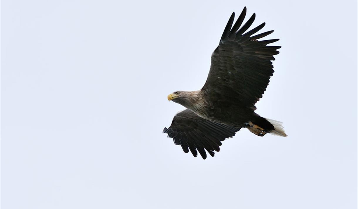 Here golden eagles can be seen close to sea level. They are often seen hanging in the updrafts over the slopes at the southern tip of Eriskay. On the approach to Barra, look out for golden eagle, white-tailed eagle and peregrine around the larger islands.