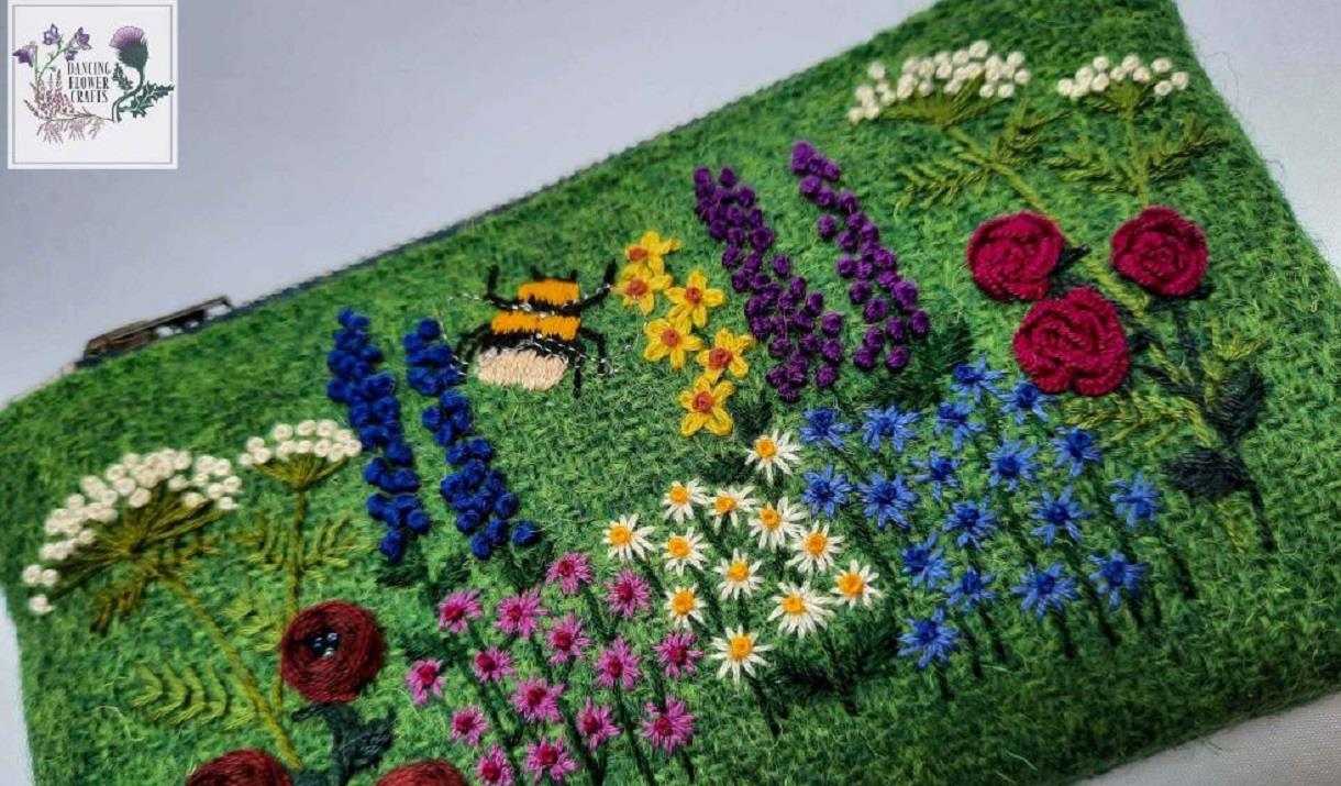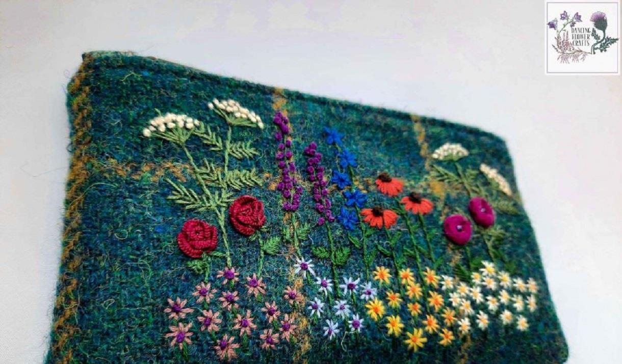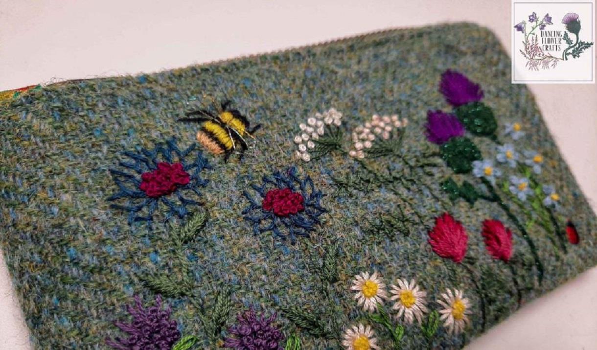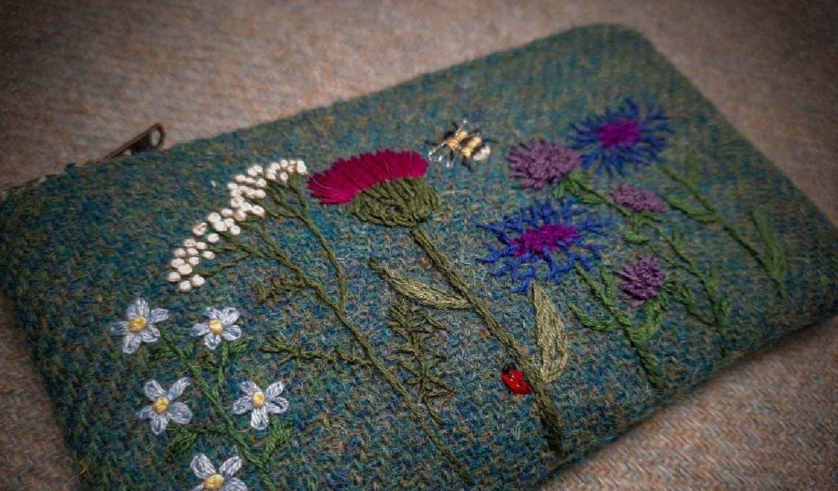 Harris Tweed® is a spectacular and special cloth, and I visiting the weavers to select my latest Tweed for my crafts gives me even more inspiration to design and make a range of arts and crafts.I hand embroider designs on to the Harris tweed® and use spectacular lining fabrics to compliment the design.