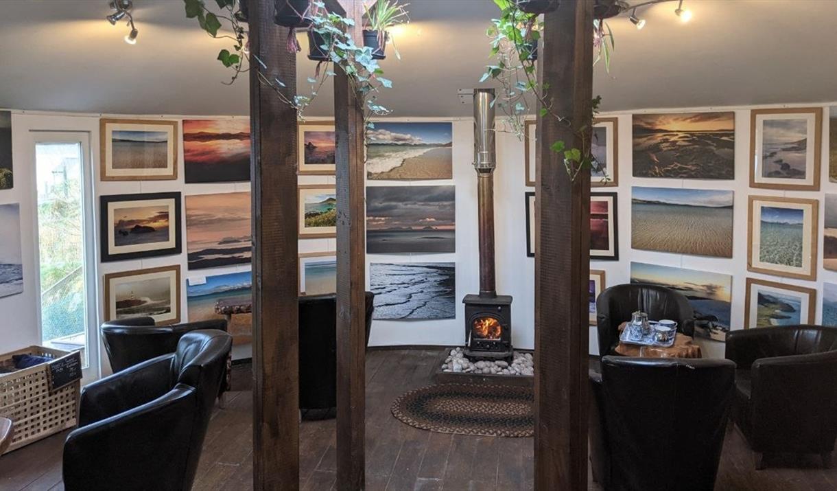 The circular Yurt Gallery with its sea views and central dome roof window creates a bright and airy exhibition space. A wood burning stove keeps it cosy in cold weather.