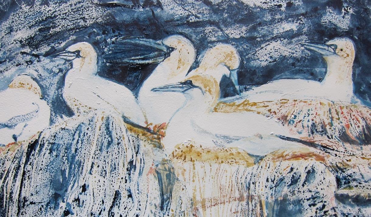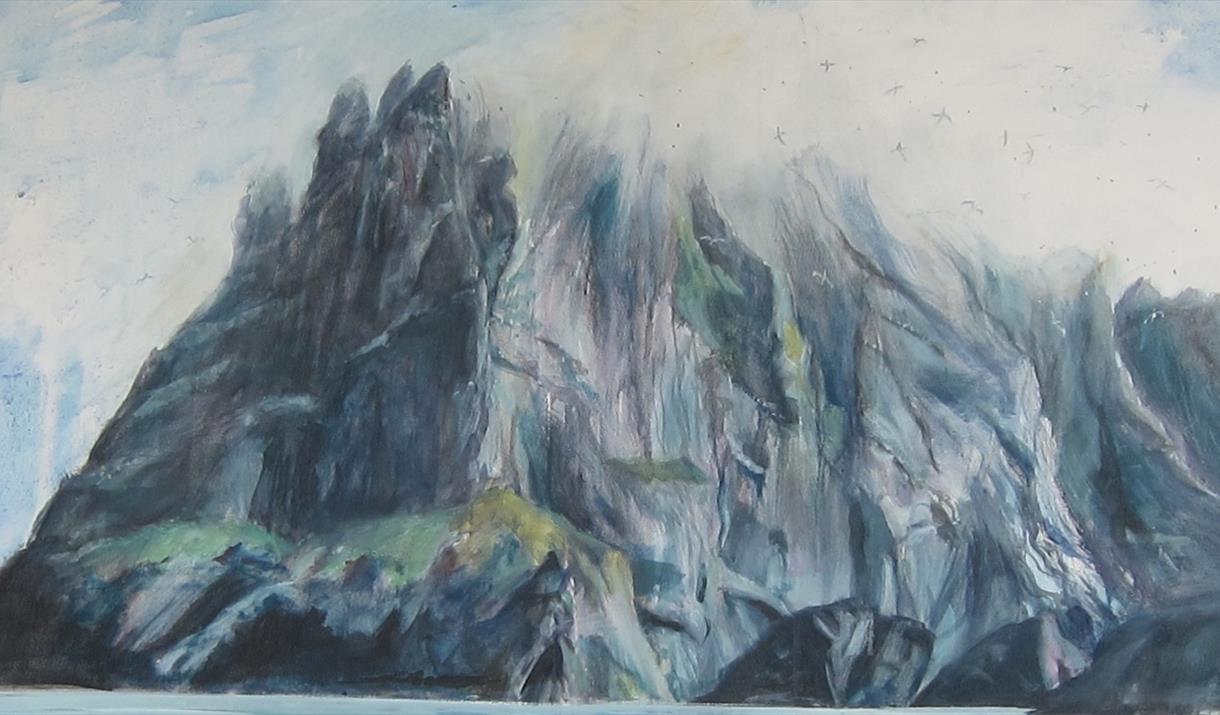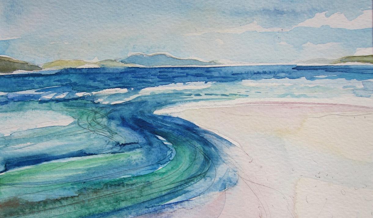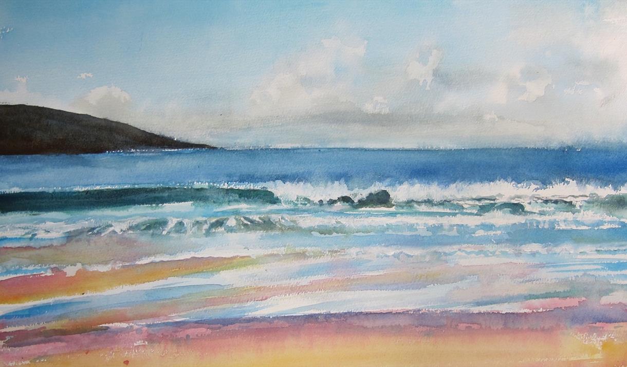 Isle of Harris watercolour artist Margarita Williams of Holmasaig Studio Gallery, lives in the village where she was born, situated in spectacular scenery of the Bays Road on the rocky South East of Harris. Her varied work is inspired by the unique Hebridean landscape, wild flowers, seascapes, seabirds, wildlife, St. Kilda, and the crofting environment. Her time studying at the Glasgow School of Art using dyes in textiles led to her interest in the transparent medium of watercolour paint.