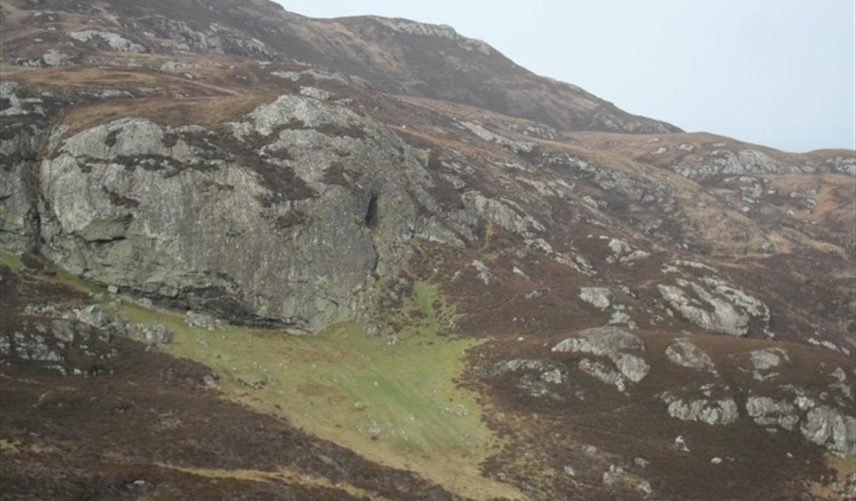 Coming back to the west side of the bridge or stepping stones you should be able to pick up the (argocat) track that leads you west towards the old water tank near Loch nan Smalag. Keeping to the south of the loch and up on the shoulder (Bealach an Easain) on Ben Kenneth you’ll pass by Coire na Cuilc. Venturing down to a grassy section with a large rock face on your left, keep looking up and you’ll see a recess in the rock - this is the cave! Access is best attempted via the grassy ledges to the west of the cave. Keep looking upwards and you might even spot a glimpse of the Golden Eagle soaring nearby.
