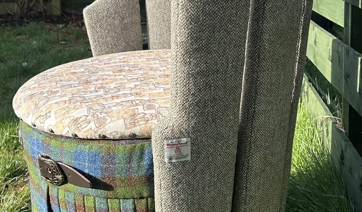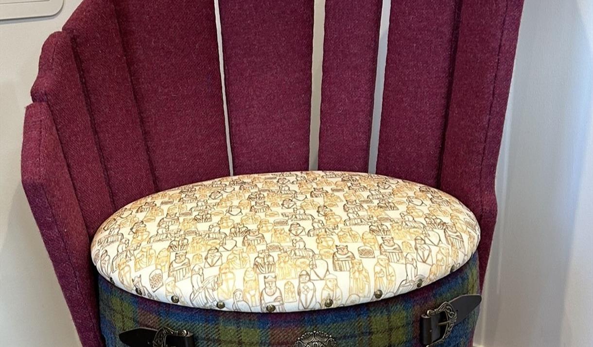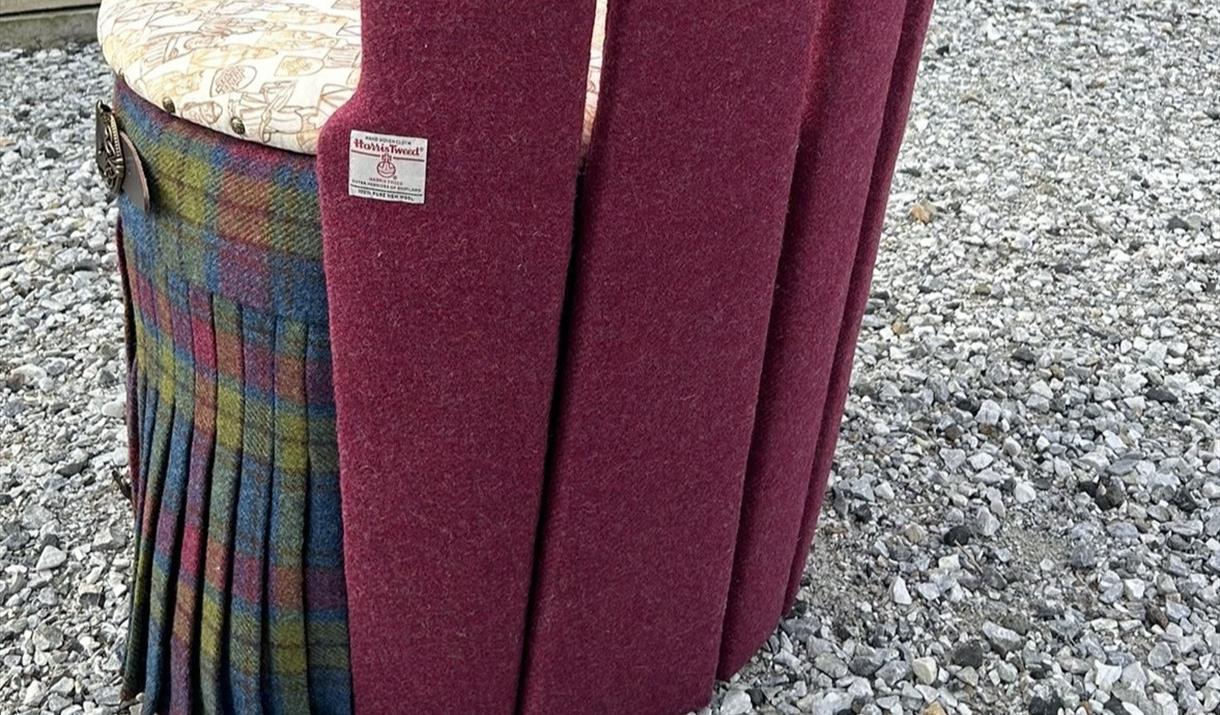 The infamous icons of the Hebrides inspired the design and creation of our handmade chair from a whisky barrel. This chair is a celebration of the most famed of these icons. The staves at the back of the chair represent the mythical and majestic Neolithic Callanish stones. A remnant of prehistoric religious activity or an astronomical observatory that does not cease to inspire and fascinate visitors today. The seat is imprinted with the mysterious archaeological treasures of the famed Lewis chessmen which were uncovered on the sands of Ùig beach on the Isle of Lewis (Eilean Leòdhais) in 1831. They were believed to have travelled across the seas from Norway in the early 13th century. The glass rest is turned from wood sourced in the Stornoway Castle grounds. These outstanding woodlands contain a varied and rich collection of trees, a rarity on the island. The whole chair is covered in the world-renowned Harris Tweed and fashioned into a kilt at the front. A cloth whose smell so distinct transports me back to my youth where I made the bobbins in my father’s loom shed where he created the big tweed 'an clò-mòr'. A cloth whose rich history is woven into the landscape, its heritage, and a people`s struggle.